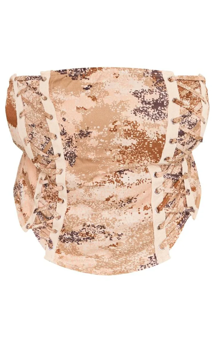 Channel all the chic vibes into your new season wardrobe with this plus stone printed lace up side bandeau crop top, you won’t be able to resist. Made using a stone hue printed material with lace up side design and a cropped length, everyone will be asking about this plus crop top. Pair it with some faux leather bottoms, clear slip-on heels and gold hoop earrings to elevate the look further.