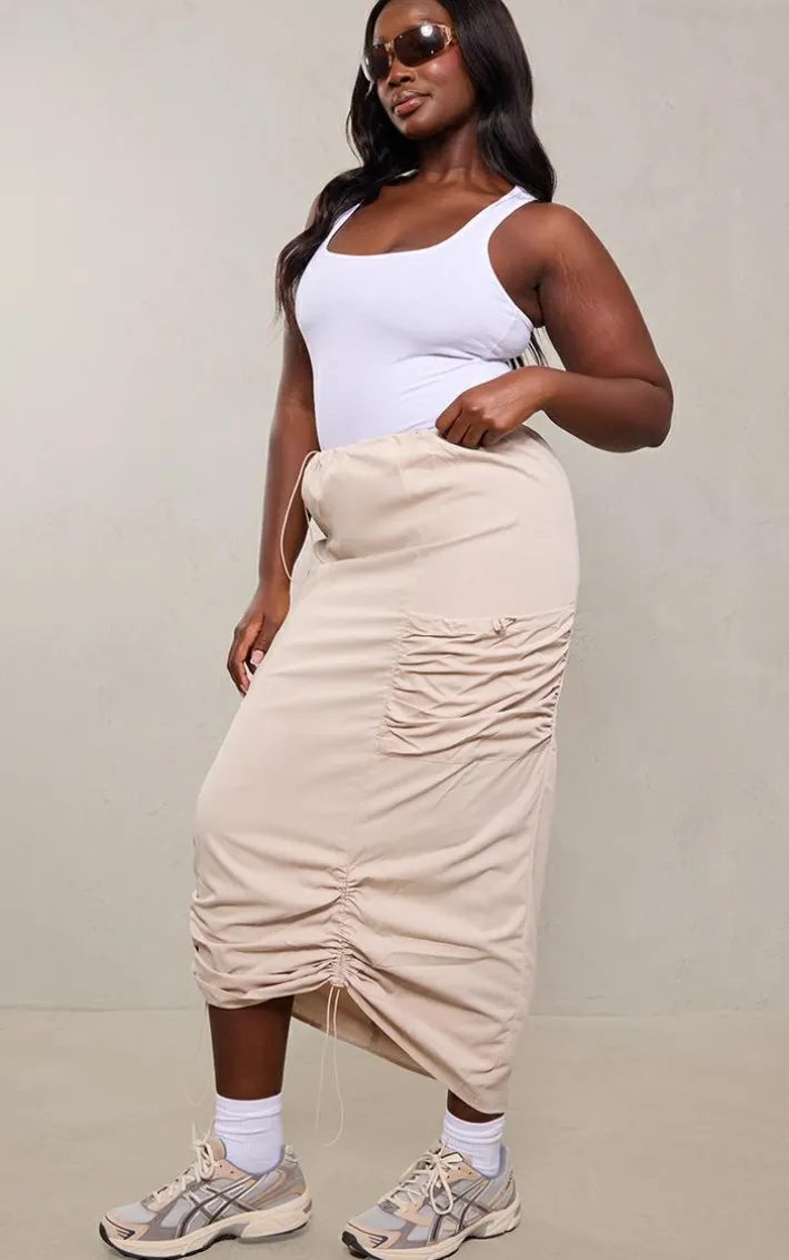 For an Insta worthy look, this plus stone ruched cargo pocket maxi skirt is essential.This skirt is brought to you in a stone material with a ruched design giving you a flattering fit you won’t be able to resist. With a cargo pocket design, this maxi skirt will have you feeling edgy all season. Why not team with a pair of fresh sneakers and a basic tee to complete the look everyone is talking about.