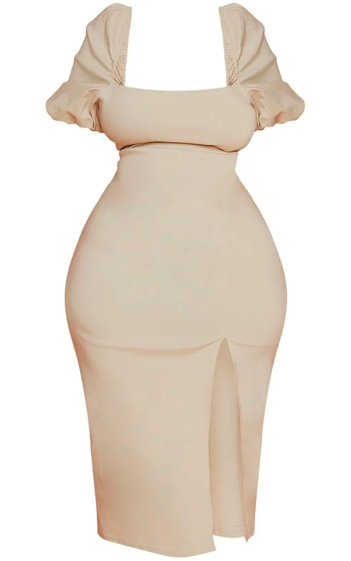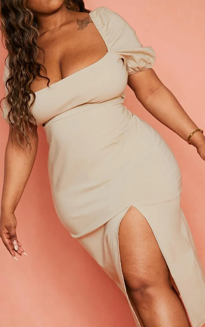 Have all eyes on you in this unreal midi dress. Featuring a stone hue stretch woven material with puff sleeves and a midi length. Style with heels, accessories and a mini bag for a look that we just can’t get enough of.