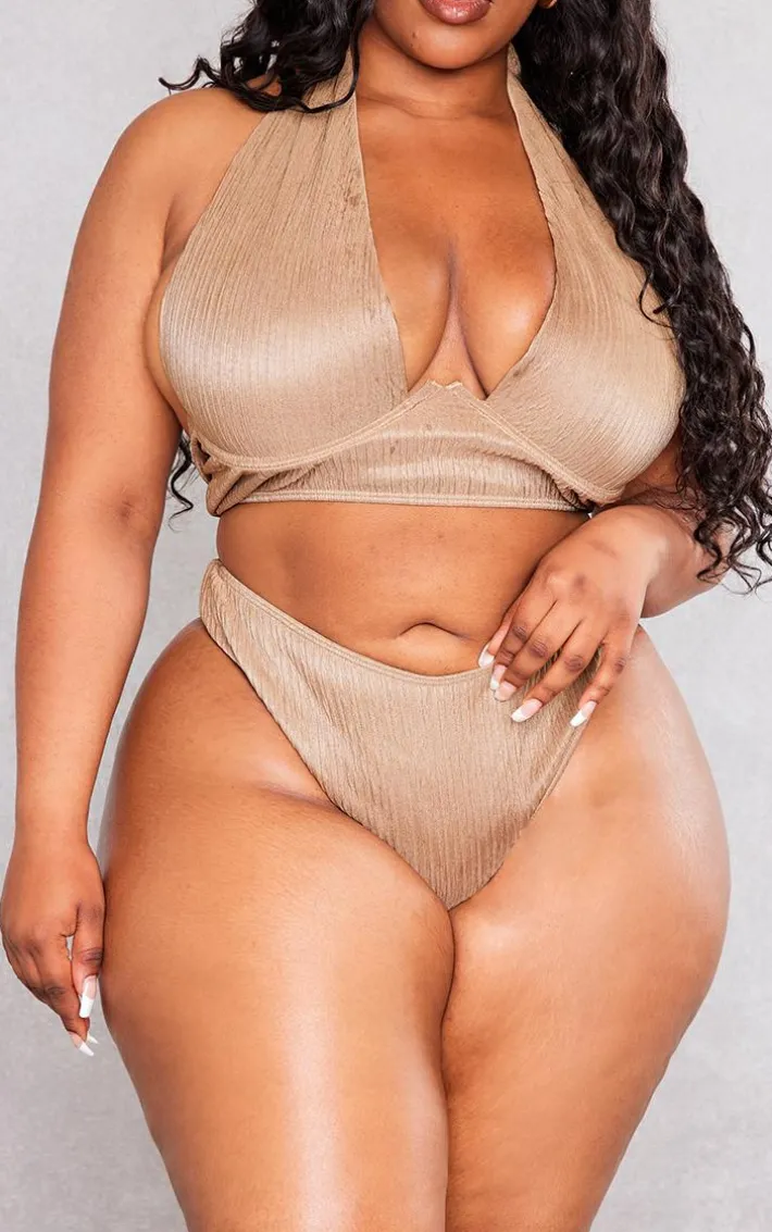 Show off your shape in these plus taupe plisse high leg bikini bottoms. Brought to you in a taupe plisse material for a little added luxe. With a high leg design for a flattering fit, you are sure to be showing off your shape in all the right places. Simply style with the matching bikini top and some gold accessories to finish off the look we are loving.