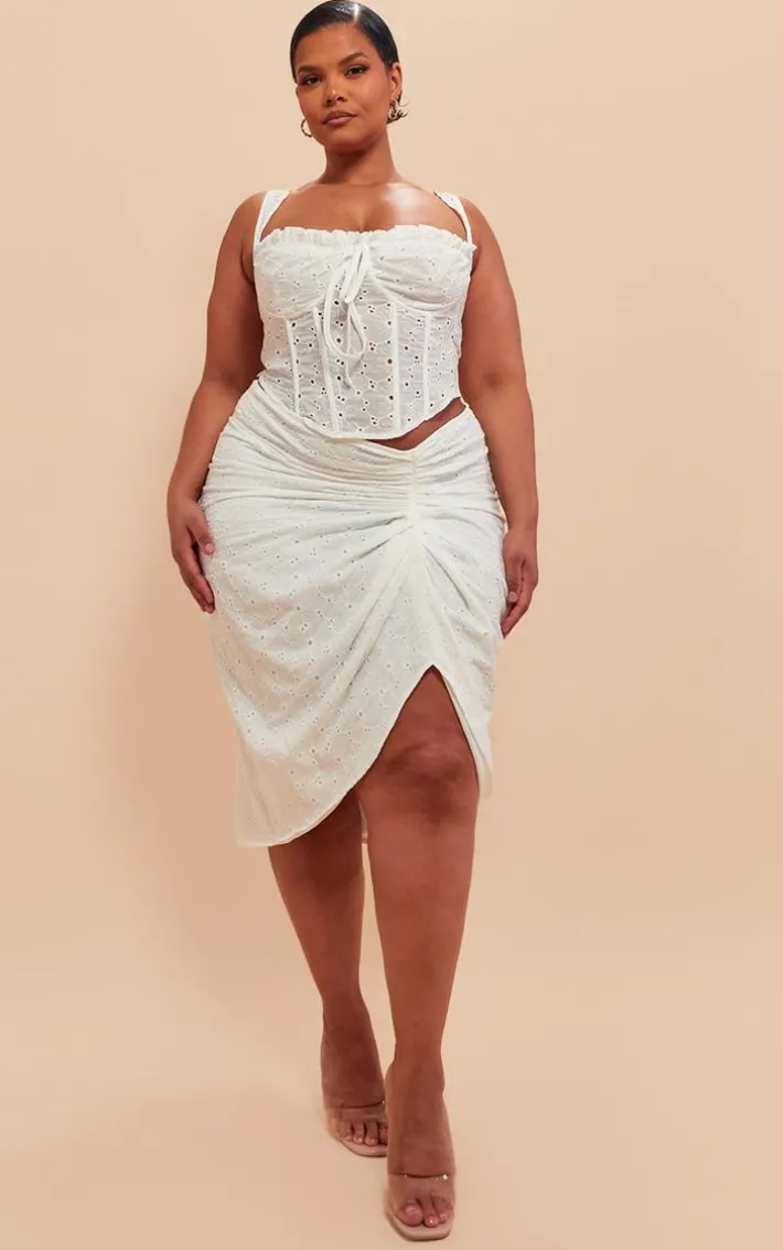 Bring a subtle touch of chic to your new season look with this plus white broderie structured corset top. Made from a white hue broderie material with a structured corset fit that is sure to show off your shape in all the right places, how can you resist? Style this corset top effortlessly with the matching skirt, heels and gold accessories for a look that is sure to have all eyes on you.