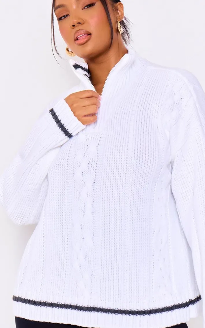 Elevate your cosy knit collection with this plus white chunky knit zip detail sweater. Brought to you in a white hue chunky knit material with zip detailing and a comfy fit, you really can’t go wrong. Style this white sweater with leggings and sneakers for a look that’s perfect for those on-the-go days.