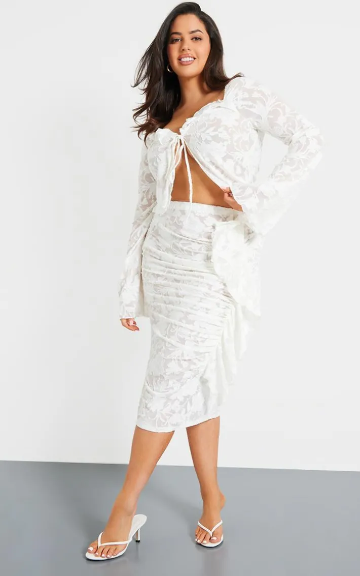 Found some last-minute weekend plans ? Then you need to add this plus white devore frilled tie crop top to your basket. Made from a white devore material with a frilled tie design, how could you say no? With a cropped length, this top is sure to have you feeling confident. Team with the matching skirt and your fave heels for a chic finish.