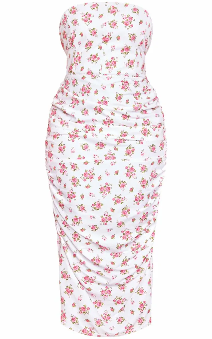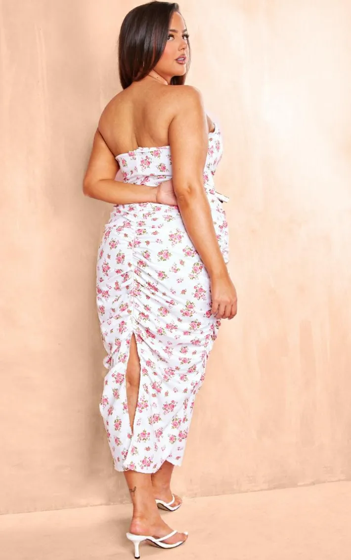 Get ready to have all eyes on you with this plus white floral print strapless corset ruched side maxi dress. Thisdress is brought to you in a white floral print material with ruched detailing and a strapless design, what more could you ask for? This women’s plus maxi dress with it’s figure-hugging fit will have you being the topic of everyone’s conversation. Wear with your dreamy high heels and accessories for a look that we can’t stop crushing on this season.