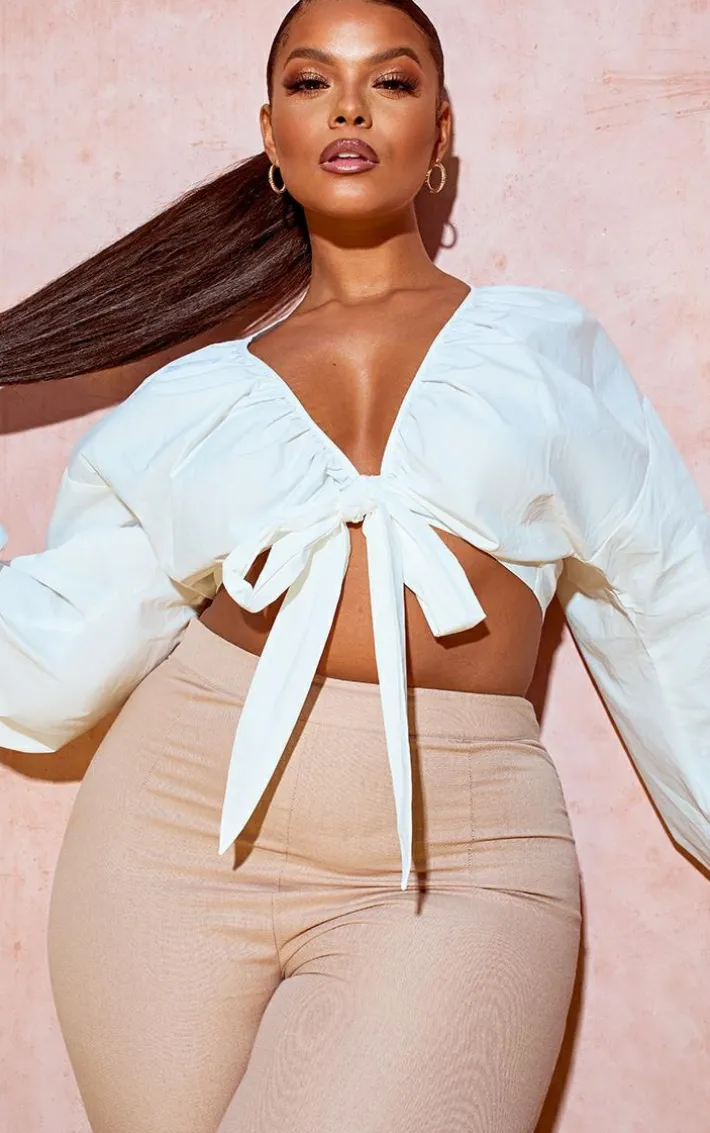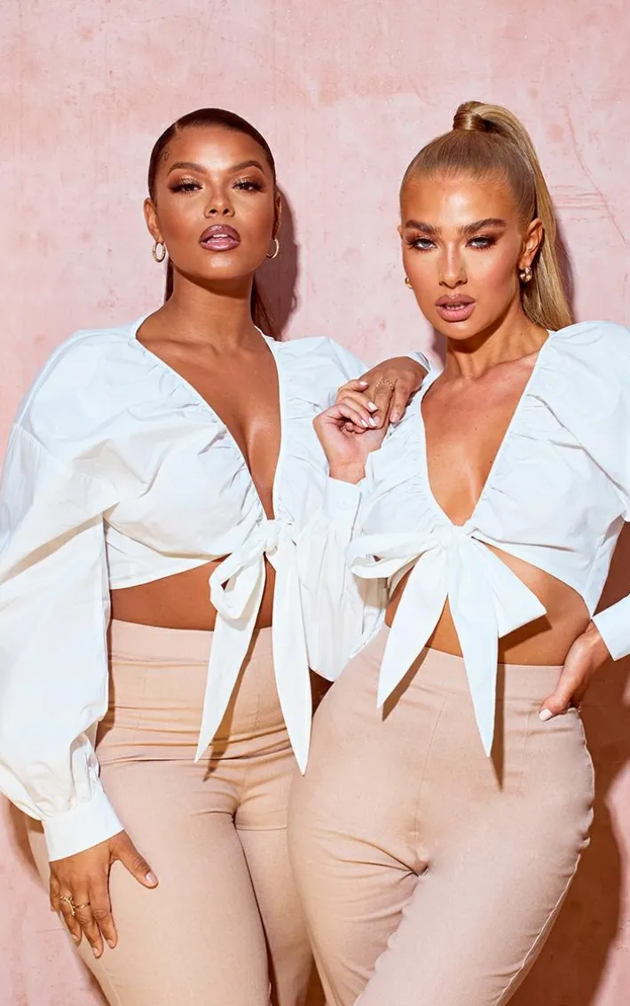 We are loving this crisp white blouse for any occasion. Featuring a white material with a tie front detail and ruching on the neckline, we’re obsessed. Team this with nude bottoms and barely-there heels for a chic look we are loving.