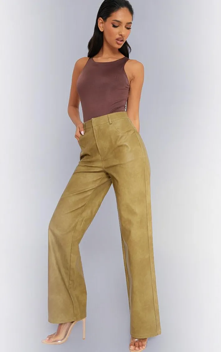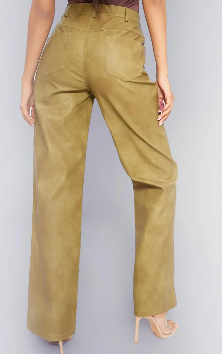 We’re obsessed with these olive washed faux leather straight leg pants for your new season wardrobe doll. Featuring a dreamy olive washed faux leather material that is so on trend right now and a straight-leg fit that is seriously flattering, how could you say no? These pants can be dressed up or down for any occasion and we know you won’t be able to resist working your unreal styling techniques. Go for a seriously basic ‘fit with a tonal bodysuit, clear heels, and gold accessories.