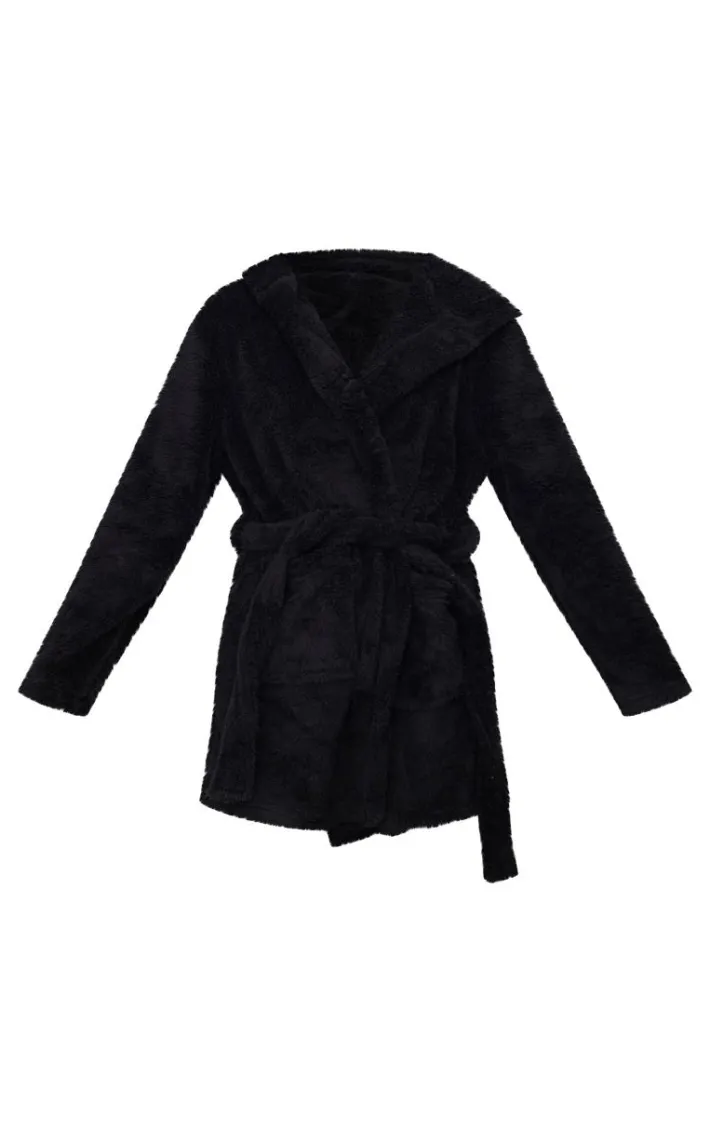 Wind down in this seriously comfy bath robe. Featuring a black fluffy material with a ‘PrettyLittleThing’ logo embroidered on the back, a hooded design and a tie waist, team it with your fave PJs and slippers to complete the look.
