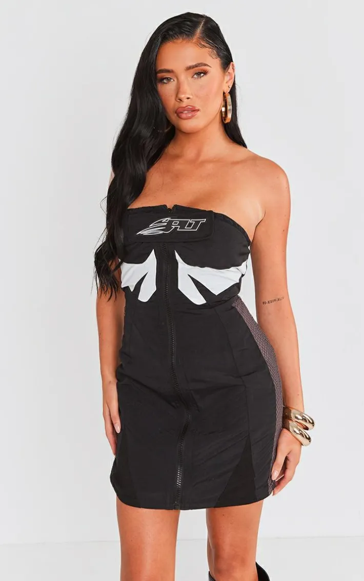 Add a little edge to your weekend wardrobe with this PrettyLittleThing black motorcross panelled bandeau bodycon dress, get ready to have heads turning for all the right reasons. With a black material, a panelled design and a bandeau style, this bodycon dress just went straight to the to pog your hit list. Pair it with knee high heeled boots, a mini bag and gold jewelry for a look everyone will want.