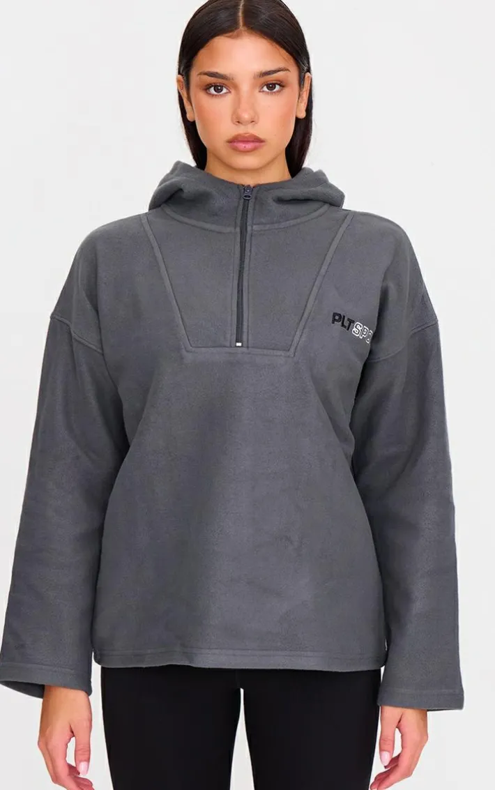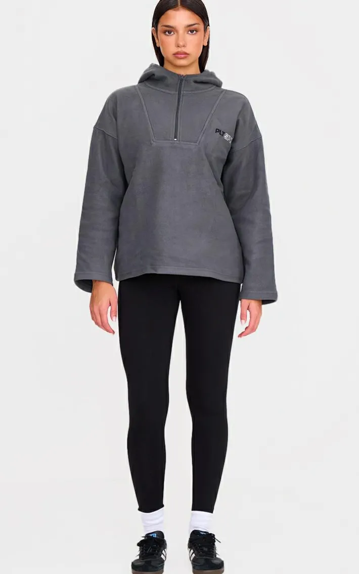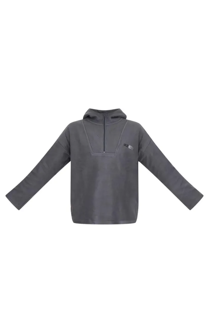 Upgrade your off-duty look with this must-have half zip fleece, it’s sure to be a staple piece for your new season wardrobe and beyond. Featuring a charcoal fleece material with a half zip detail and a hooded design, what’s not to love? An oversized fleece is perfect for keeping you cosy and this one is sure to be at the top of your wish list. Team this grey fleece with comfy bottoms, fresh kicks and matching accessories for an effortlessly chic vibe.