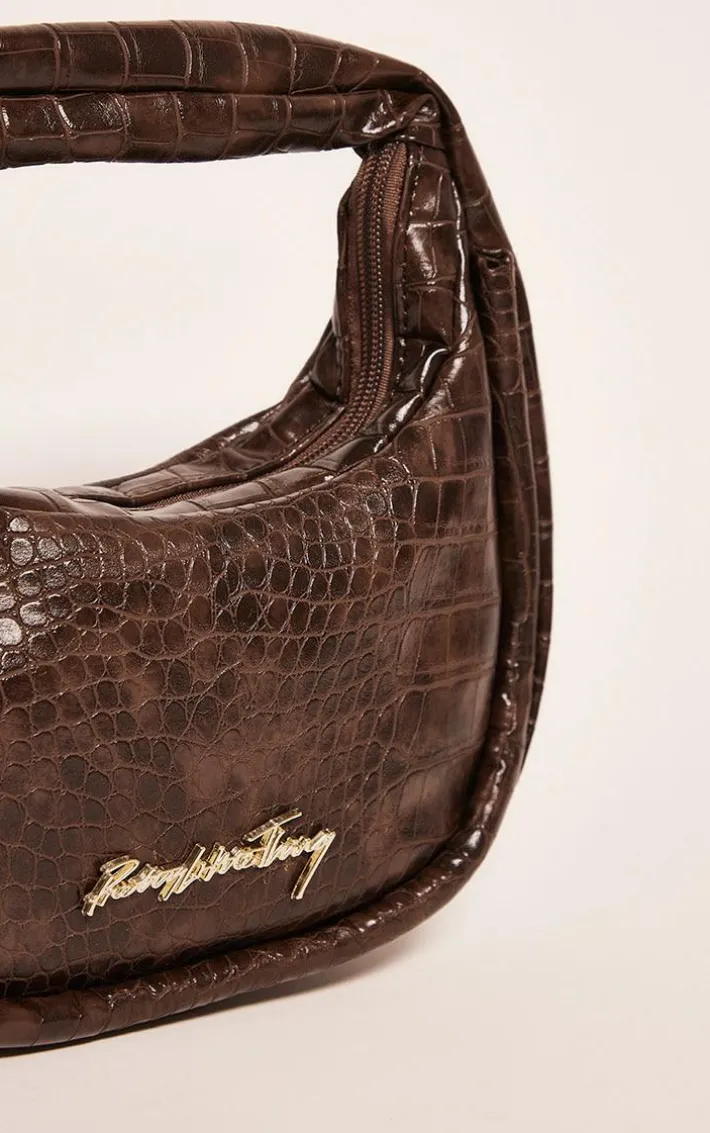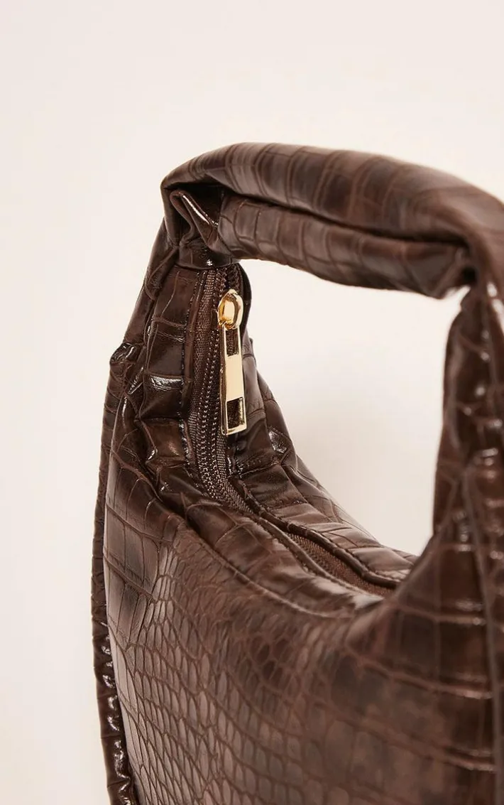 This bag is the perfect accessory for any occasion. Featuring a chocolate brown PU material with a croc print design, perfect for elevating any look.
