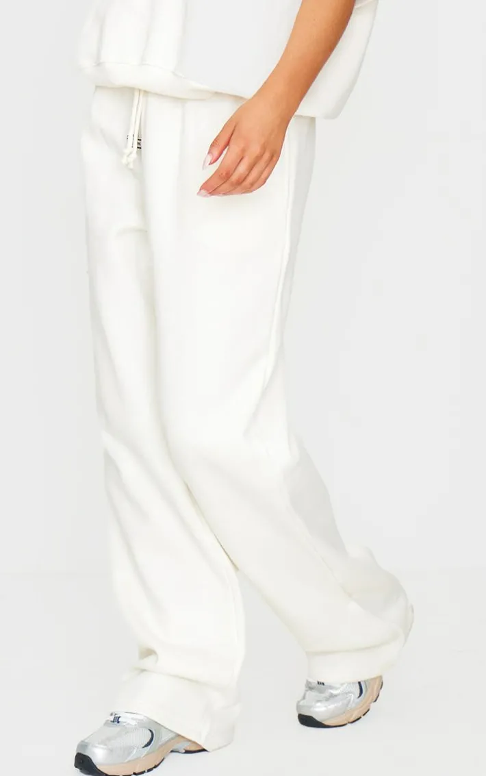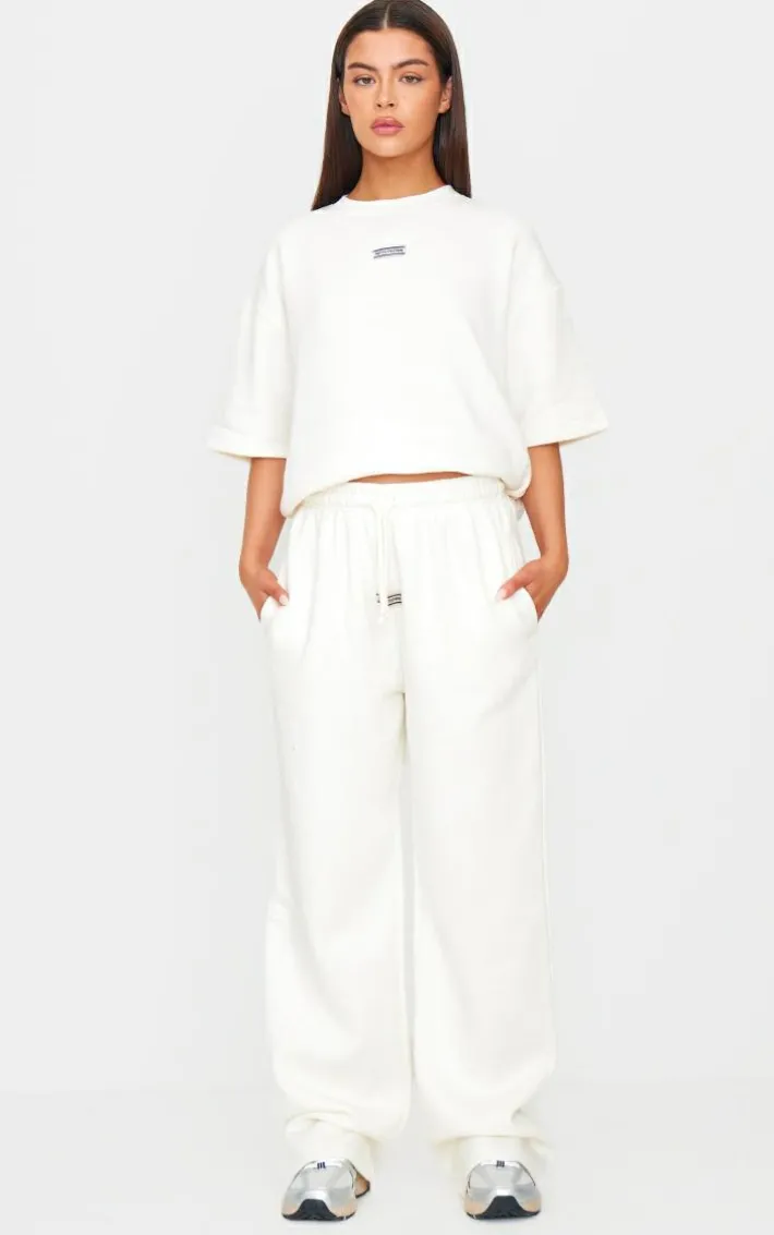 Be on trend this season with these PrettyLittleThing cream badge detail mid rise wide leg sweatpants. Brought to you in a cream material with a badge detail, a mid riseand a wide leg fit, you will bring all the edge to your outfit of the day. These sweatpants are perfect for those on the go days. Team with the matching top, sneakers and accessories to be the Center of attention wherever you step foot this season.