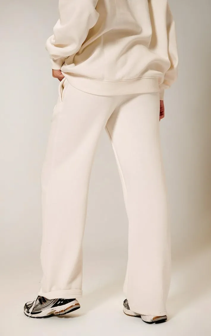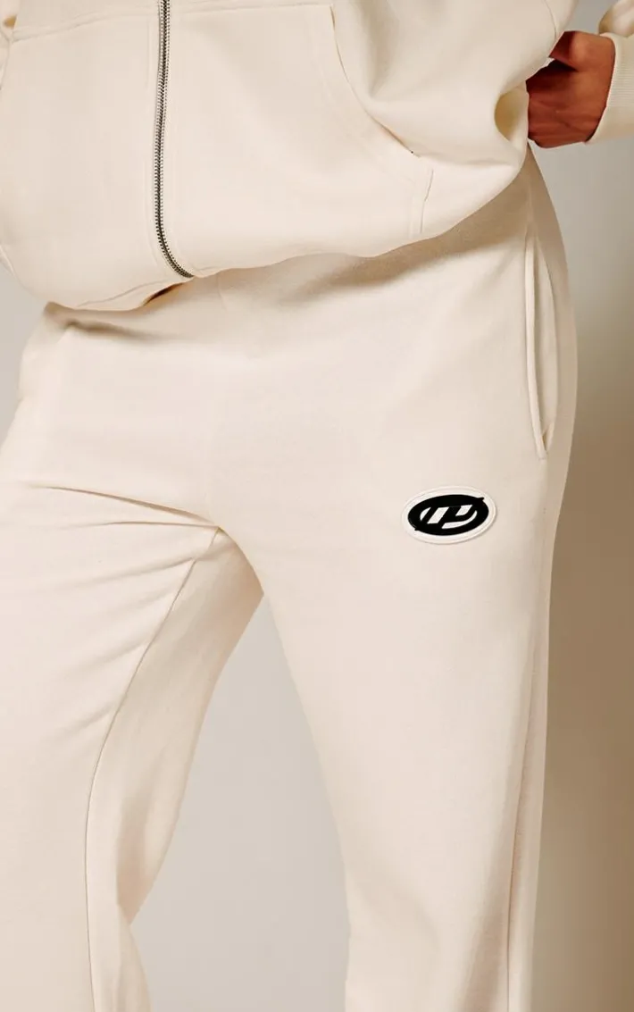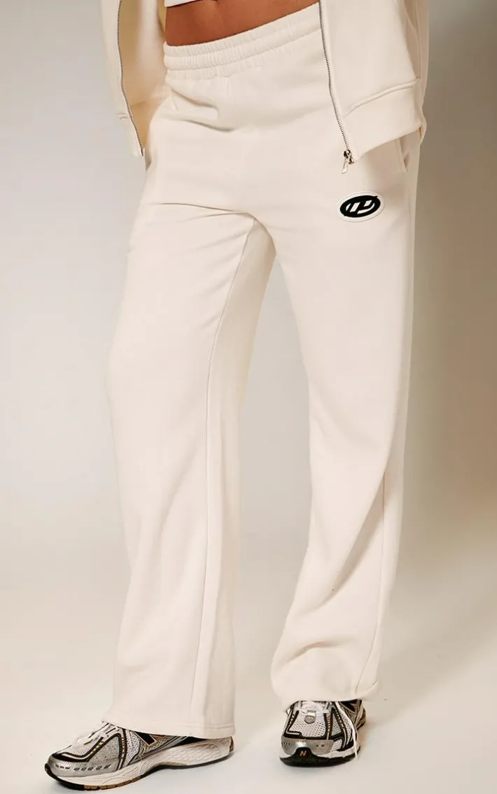 Introducing these PrettyLittleThing cream contrast logo badge wide leg sweatpants for your new season wardrobe. Brought to you in a cream hue material with a contrast logo badge detail and wide leg fit, these sweatpants are a must have. Style with the matching zip through hoodie, fresh kicks and simple accessories for an elevated look perfect for those chilled out days.