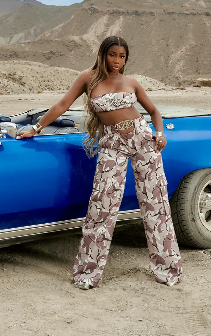 Take your everyday look to the next level with this PrettyLittleThing grey camo metal trim bandeau crop top perfect for your everyday styling and beyond. Brought to you in a grey camo material with a metal trim and a bandeau design, we simply can’t get enough. With it’s versatile style this crop top is sure to be your new go-to. Style with the matching pants, high heels and accessories for a look that we can’t get enough of.
