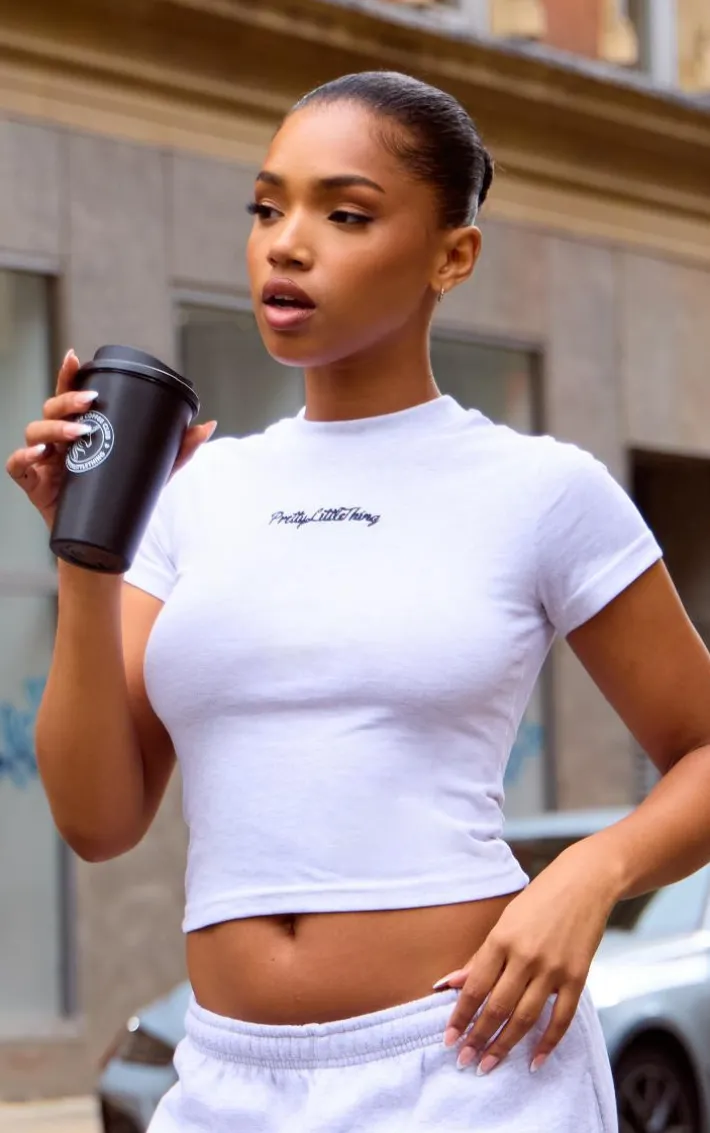 For a an effortlessly chilled vibe, opt for this PrettyLittleThing grey marl PLT embroidered baby doll tee. Brought to you in a dreamy grey marl shade, with a ‘PLT’ embroidered detail and overall chic vibe, how can you resist? Pair with some grey sweatpants, fresh sneakers and gold earrings for the ultimate off-duty look.