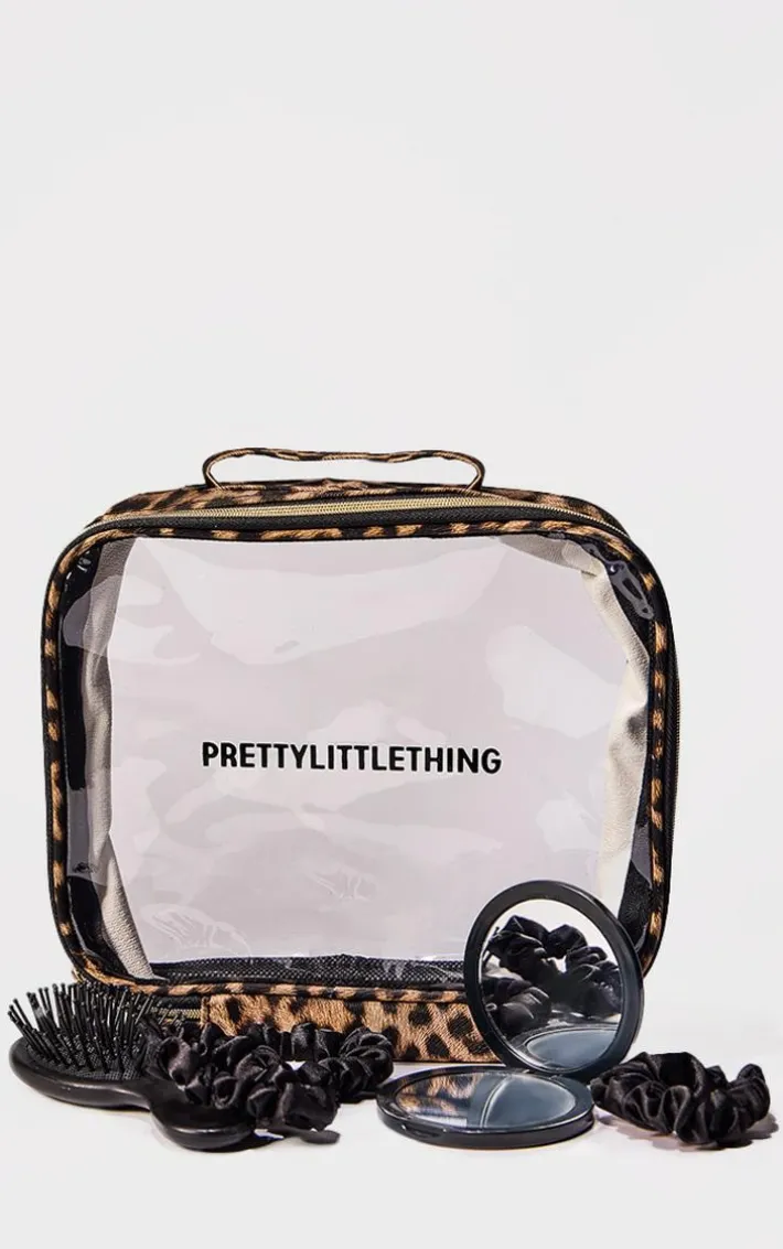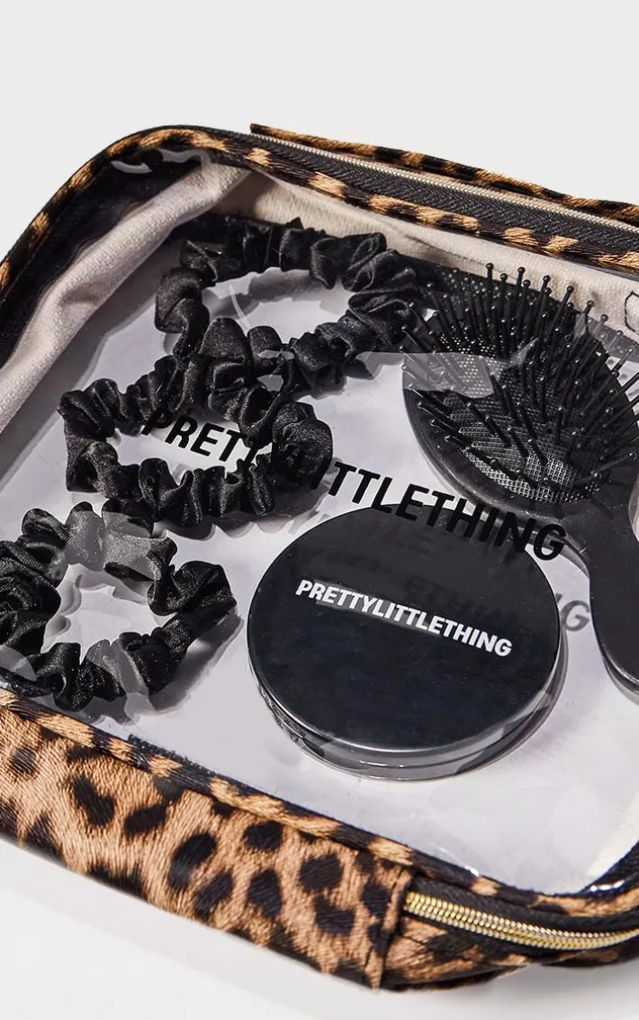 Elevate your morning routine with this PrettyLittleThing leopard wash bag gifting set. Designed for those grab and go mornings, this set has everything you could possibly need. Keep your hair serving serious style with the mini brush and scrunchies, and top up on the go with the compact mirror. All bundled up together in a leopard print wash bag, this is a must have. Perfect for gifting or treating yourself.