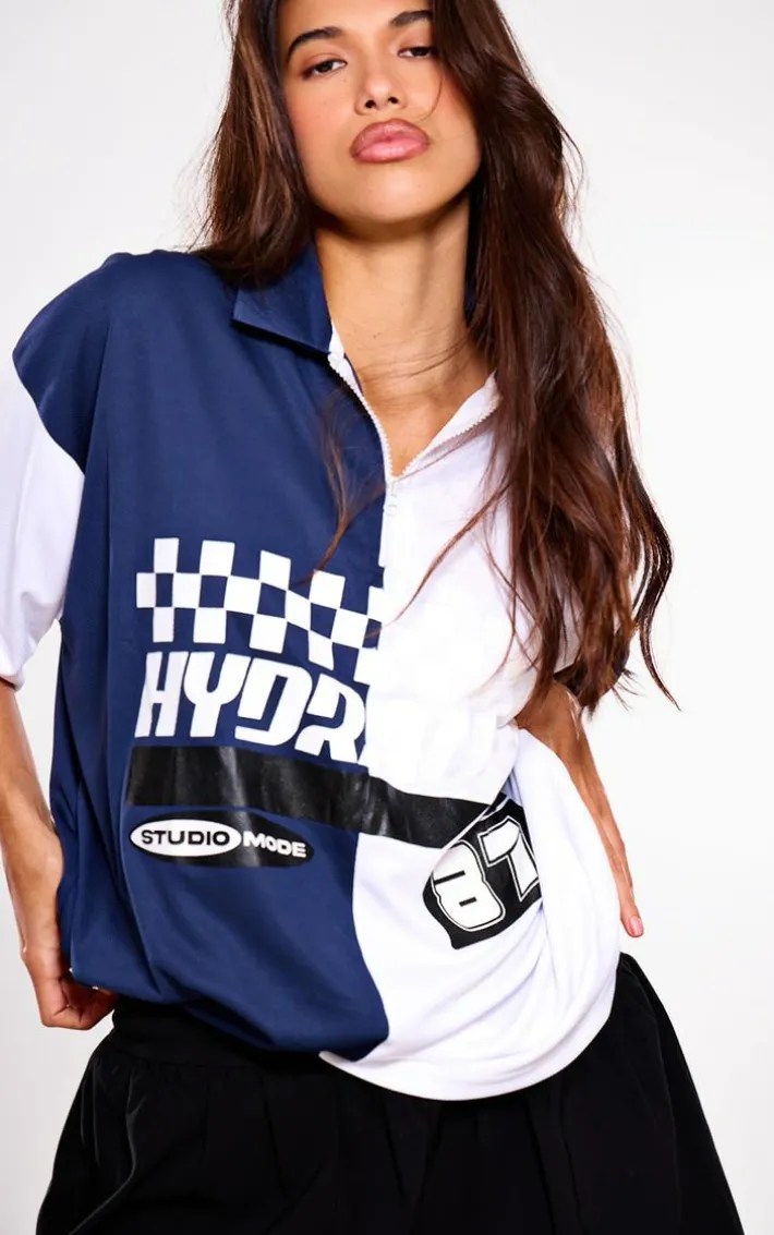 Say hello to your new style saviour, our PrettyLittleThing navy zip up short sleeve football shirt. Brought to you in an oversized football shirt, with a zip up collar feature and printed logo front, this navy shirt is what we’re loving this season. Pair with a mini skirt, chunky sole boots and any must-have combos for an off-duty finish.