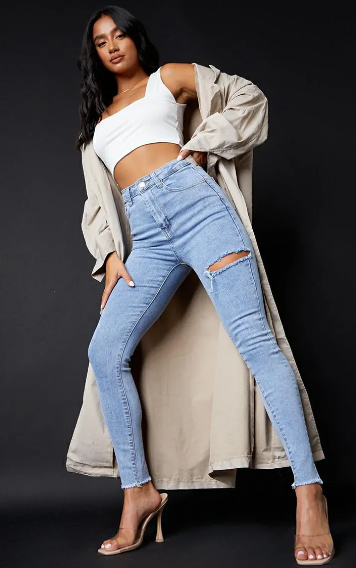 Take your look to the next level with these jeans. Featuring a vintage wash denim fabric with a thigh rip and a skinny fit. Style with a simple bodysuit, oversized blazer and mules for a day.