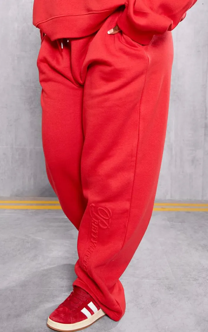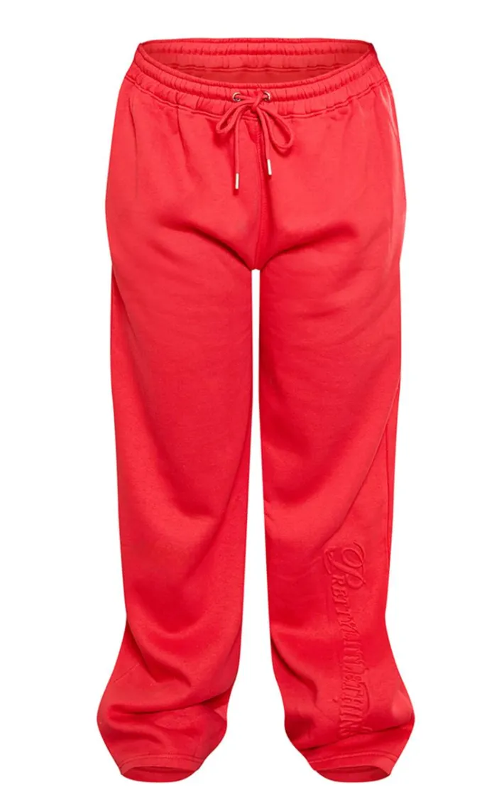 Brighten up your off-duty wardrobe with these PrettyLittleThing plus red embossed Graphic straight leg sweatpants. Brought to you in a red hue material with a ‘PrettyLittleThing’ embossed Graphic print design and a straight leg fit, what’s not to love? Style these red sweatpants with the matching Sweatshirt and your fave pair of sneakers for a look that will make you stand out from the rest.