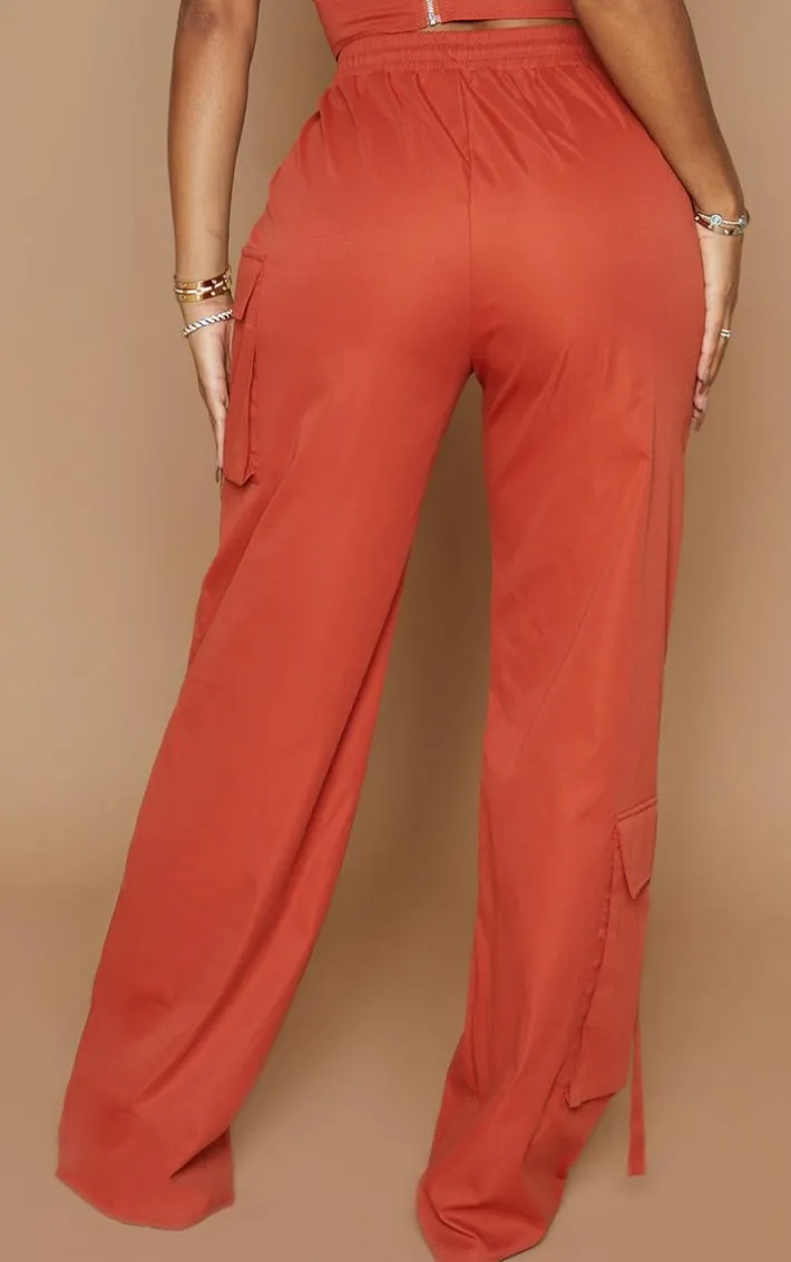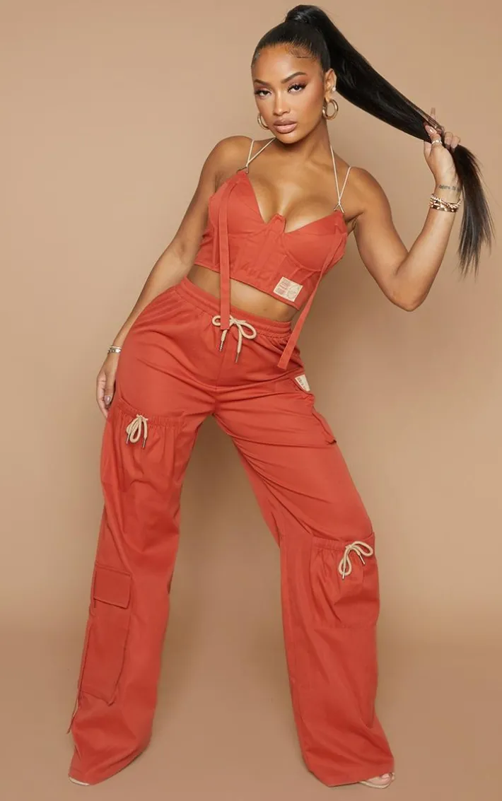 Get ready to steal the stares in these cargo bottoms. Featuring a rust material with a ‘PrettyLittleThing’ logo, pocket detailing and a wide leg fit. Wear with the matching top, heels and a mini bag for a date.