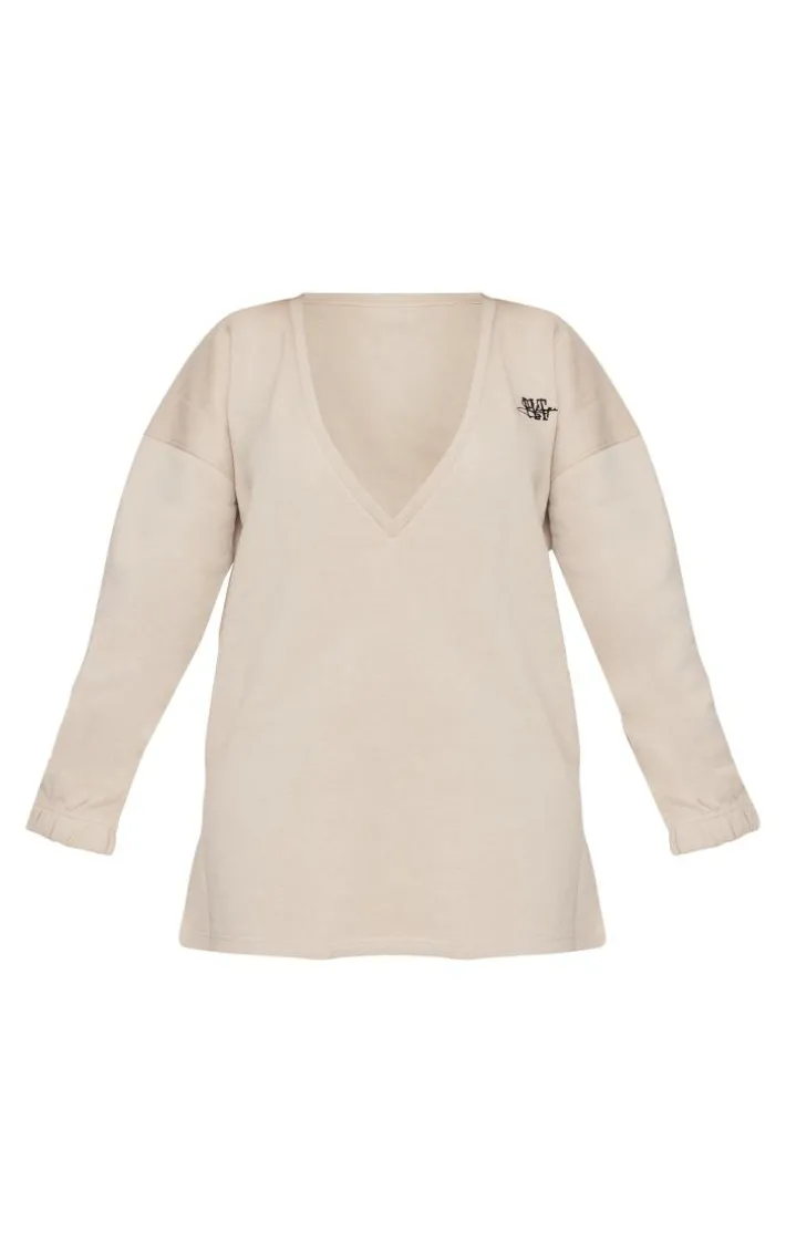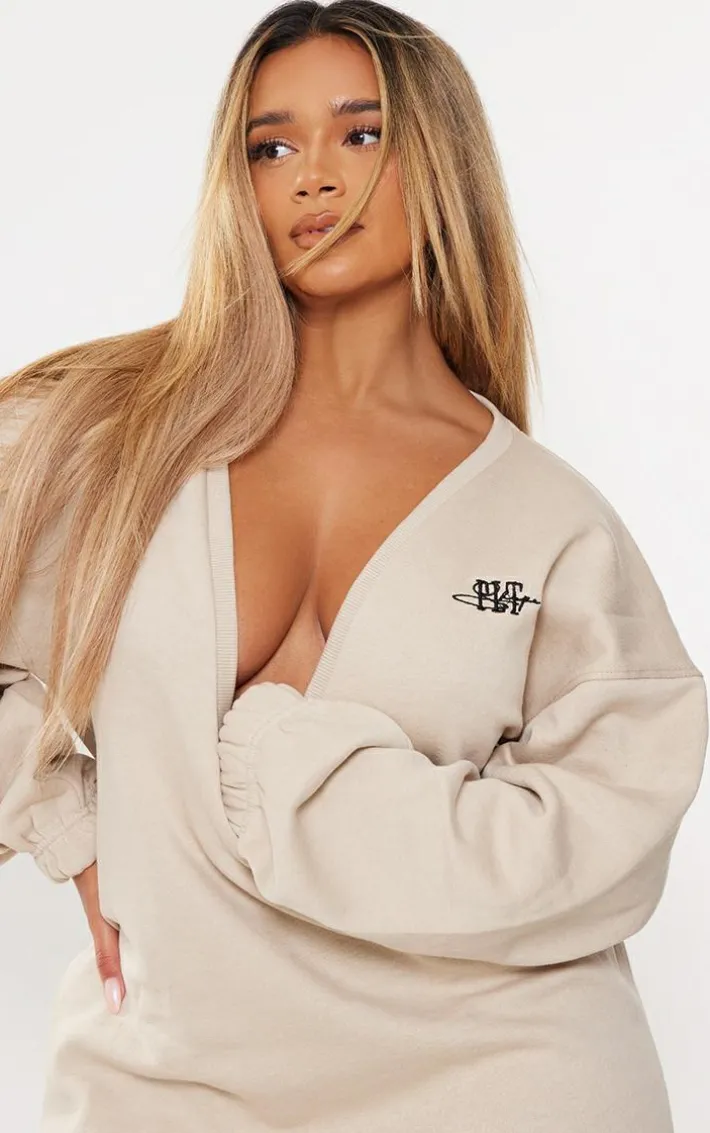 This PrettyLittleThing shape stone embroidered plunge sweatshirt dress is here to banish any of your what to wear dilemmas. Brought to you in a stone material with an embroidered design we canÂ’t get enough. From start to finish, this plunge sweatshirt dress will have you looking totally on-trend. For a next-level look simply style with some clear heels and your fave accessories. ItÂ’s a yes from us.