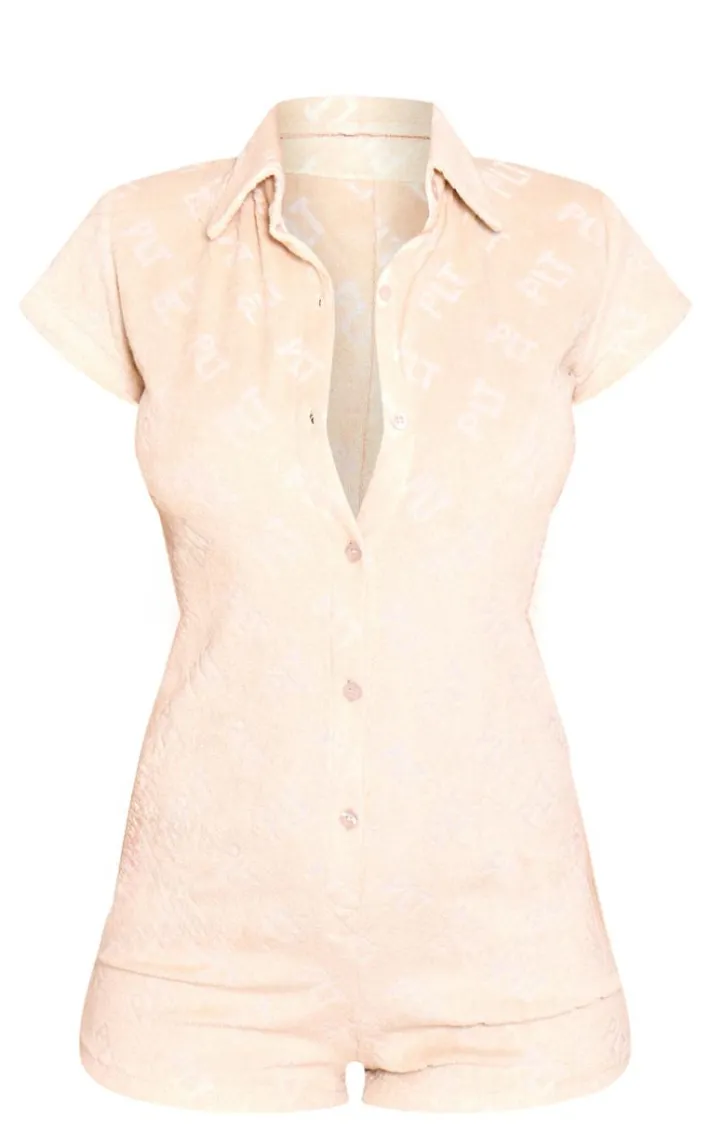 Amp up your beach look with this romper. Featuring a stone towel material with ‘PrettyLittleThing’ embossed design and button-up detailing. Wear over a matching bikini set to complete this dreamy look.