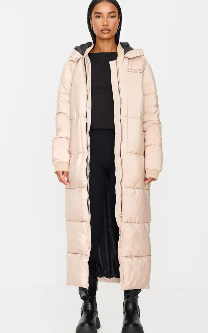 Give your outfit of the day the perfect upgrade with this coat. Featuring a stone hue material with a ‘PrettyLittleThing’ graphic and a maxi length, we’re obsessed. Team with comfy bottoms, a crop top and chunky boots for a cool, off-duty vibe.