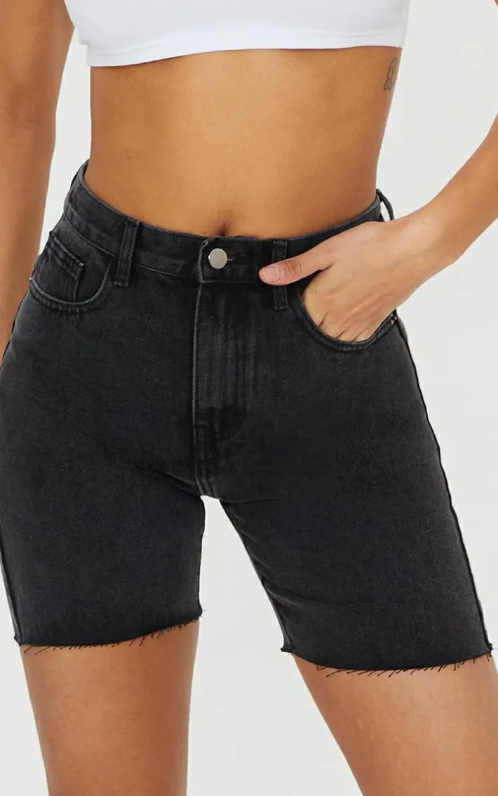 Amp up any outfit of the day with these killer shorts. Featuring a black denim material with a longline fit and belt loops, team these with a black crop top and chunky boots for an all black ensemble.