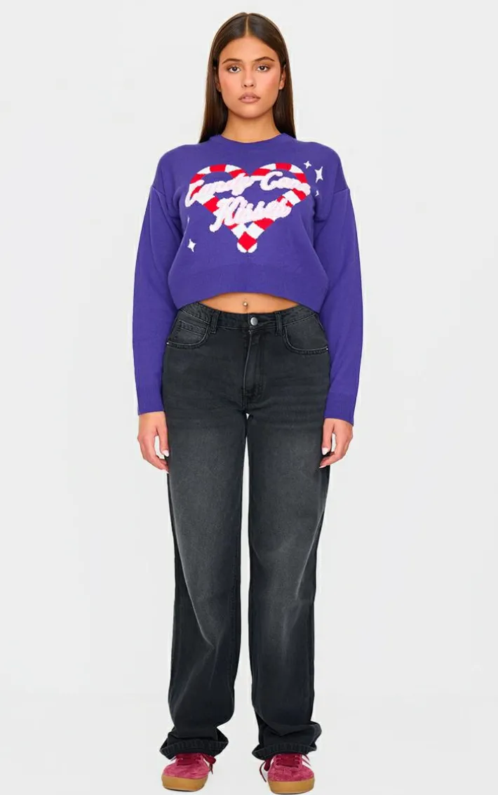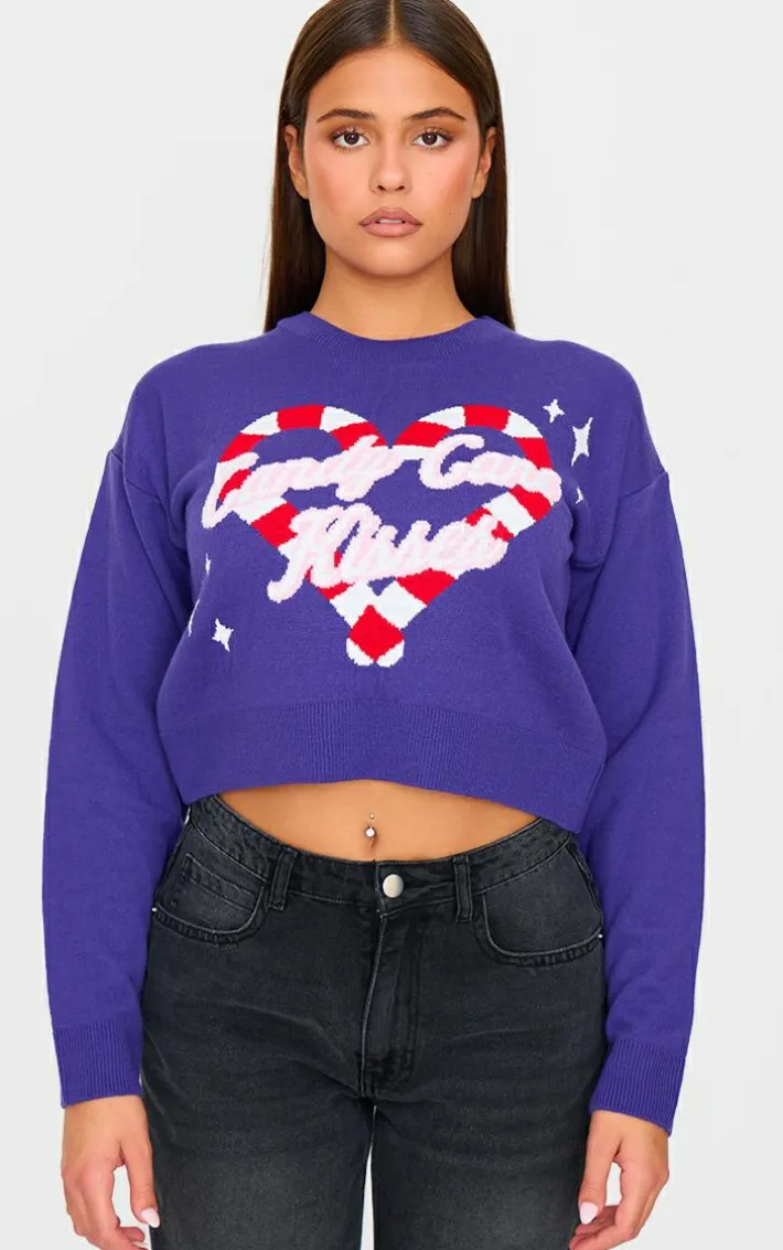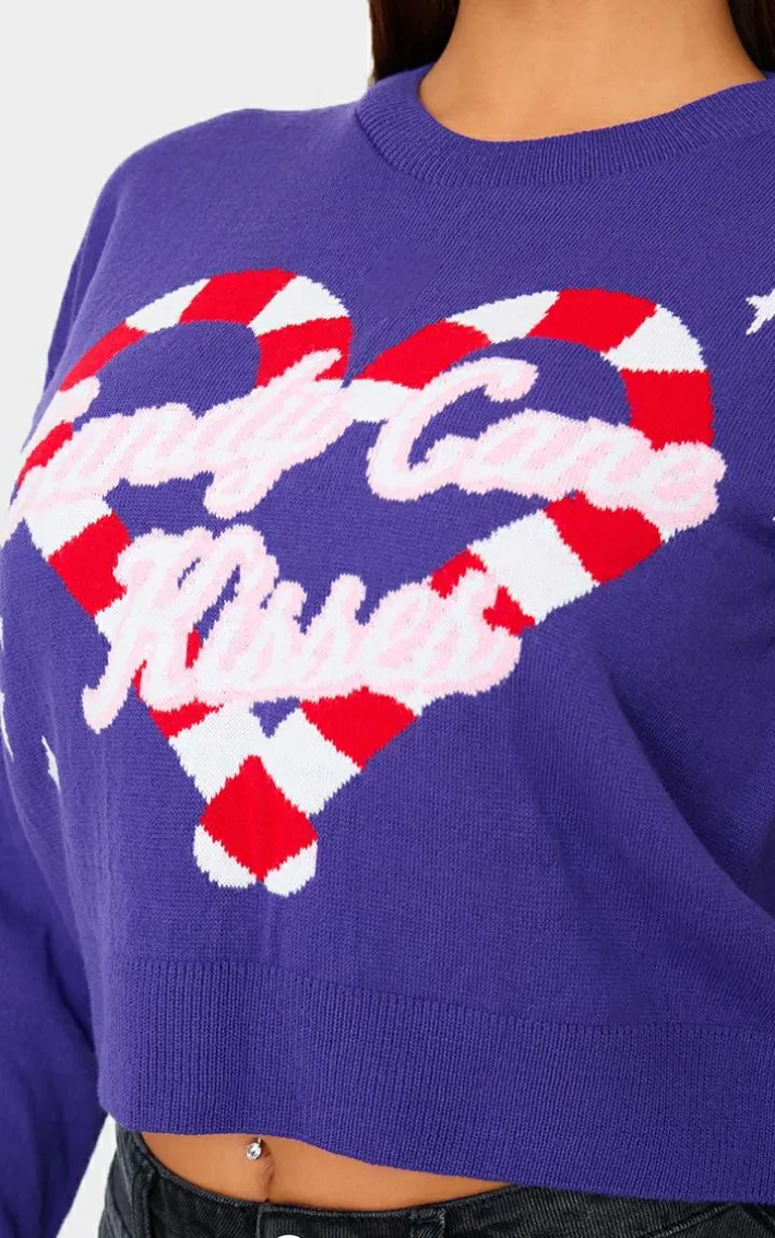 Enter the festive season in style with this purple candy cane kisses cropped Christmas sweater. Brought to you in a purple material with a ‘Candy Cane Kisses’ print design and a cropped fit, what’s not to love? Style this purple sweater with jeans and sneakers for a look we just can’t get enough of.