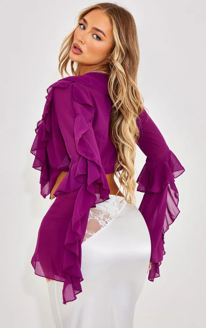 Get all glammed up this weekend with this purple extreme frill tie front flare sleeve blouse doll. Its purple hue material is sure to make you stand out from the crowd and its extreme frill detail adds all the chic vibes to your look. This blouse also features a tie-front fastening that helps show off your figure and flare sleeves for that extra edge. For that weekend-worthy finish, add a maxi skirt, clear heels and gold accessories.