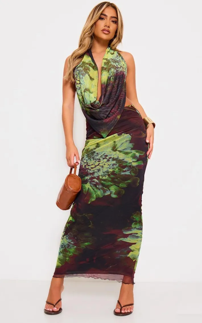 This purple floral print mesh cowl backless top is calling your name for a new weekend ‘fit. Brought to you in a rich purple shade, with a floral print design for a statement look, a mesh material, cowl neck design and backless detail. You’re going to look the best dressed at every occasion, so style with the matching skirt and silver bangles to really make an impact.