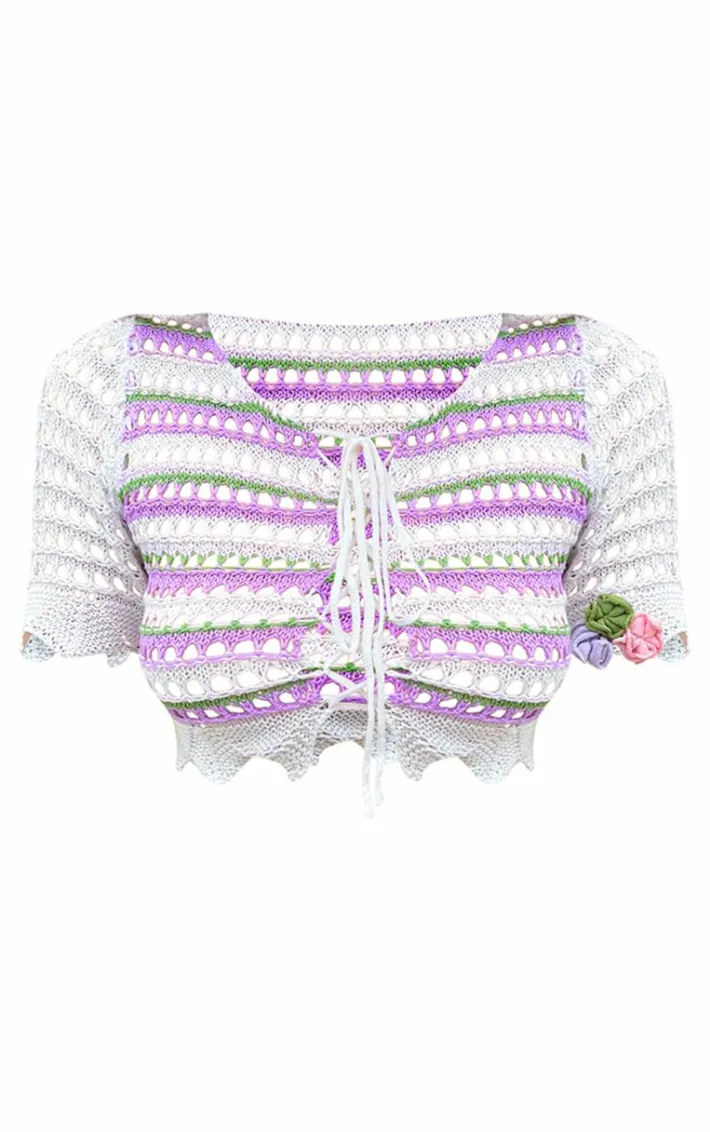 Say hello to your new season staple with this purple open crochet knit lace up floral applique top. Brought to you in a purple knit material with an open crochet design, what more could you want? This top has a lace up fastening and an applique detail, that will be showing off your shape in all the right places. What more could you want ? Style with some comfy sneakers, a statement skirt and your fave accessories for a look that have you being the topic of everyone’s conversation.