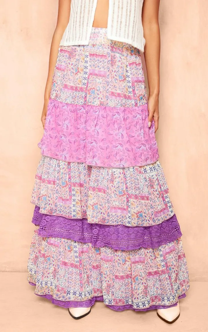Take on your weekend the right way with this purple paisley print chiffon tiered maxi skirt. Brought to you in a purple material with a paisley print design and a chiffon tiered style, what’s not to love? Pair this maxi skirt with a white top and heels for a look like no other.