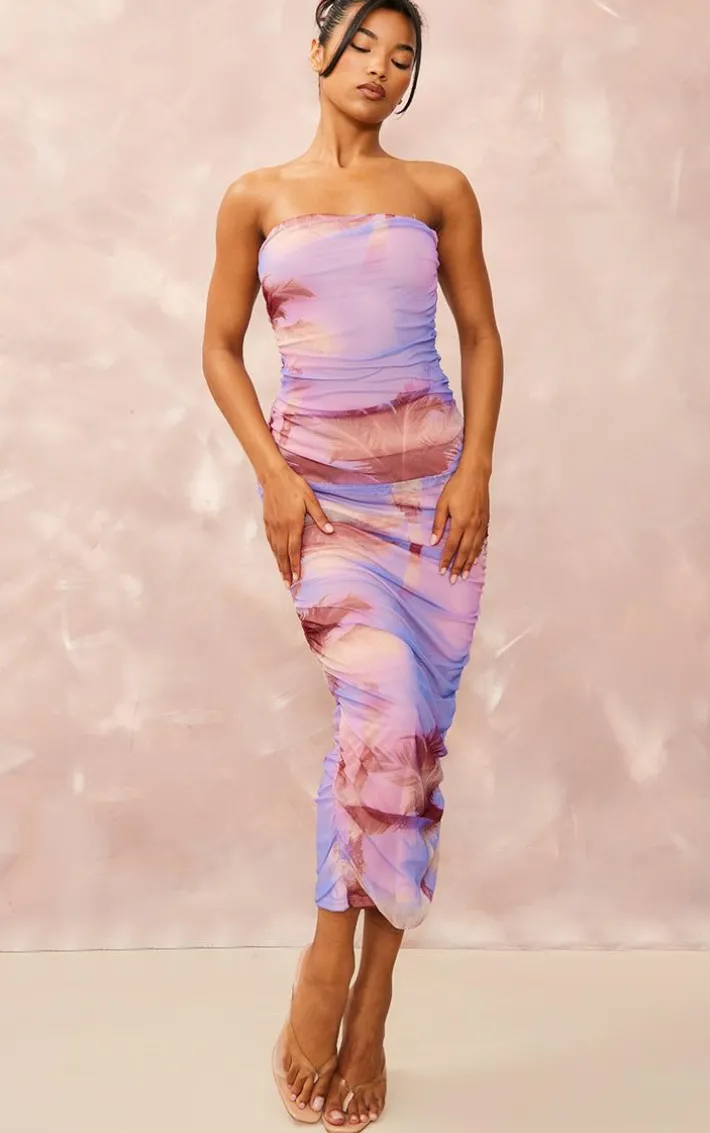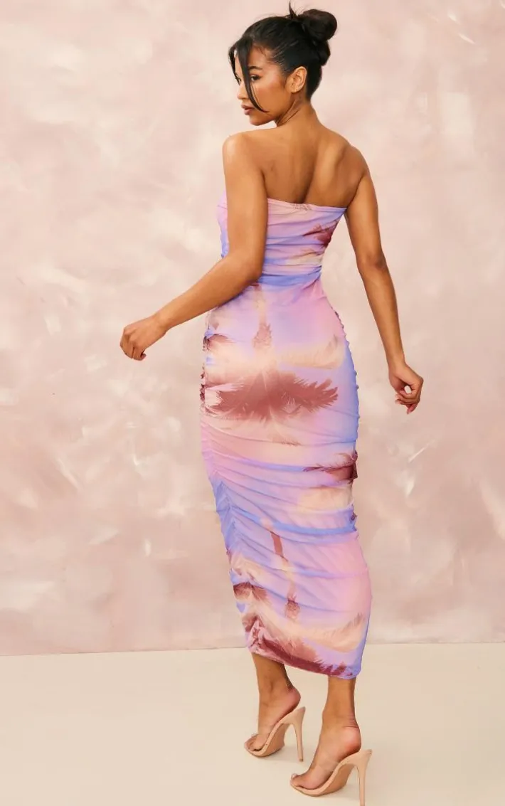 Add to your new season wardrobe with this purple palm print mesh bandeau ruched maxi dress. This unreal dress is brought to you in a purple mesh material with a palm print design that is adding all the edge to your look. With a ruched detail, this maxi dress will have you standing out from the crowd. Style with some clear heels and gold hoops for a look that will get you noticed.