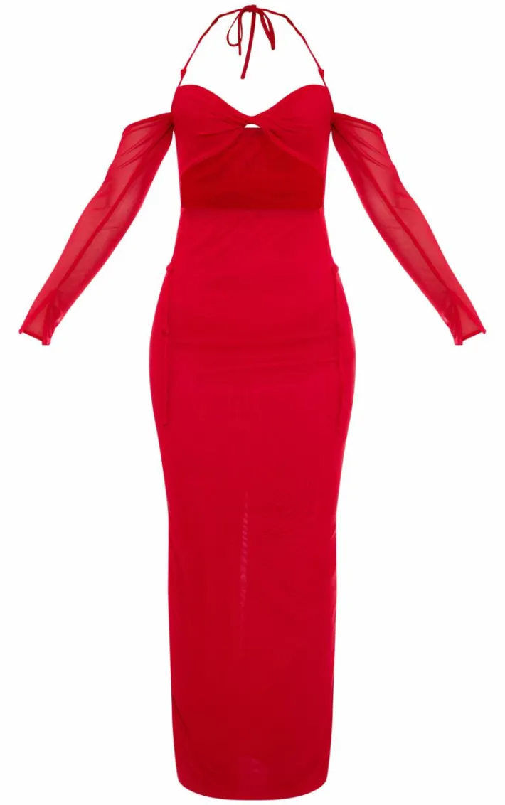 Stand out from the rest with this red mesh cut out twist detail maxi dress. Brought to you in a red mesh material with a cut out twist detail and a maxi length, you are sure to be center of attention with this unreal dress. Pair with some mule heels and gold accessories for a fool proof finish everyone will be talking about.