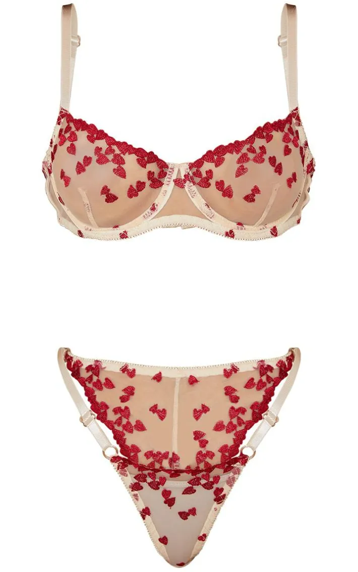 Get hearts racing in this lingerie set. Featuring an underwire bra and matching bottoms, both in mesh material with a contrasting embroidered heart print, we are obsessed. Team this with a satin robe to complete the look.