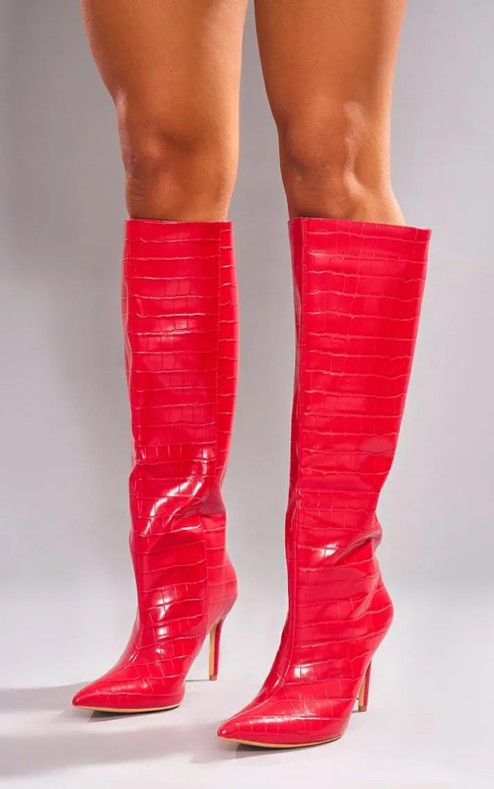 Get ready to make a serious style statement in these red PU croc detail point toe stiletto heeled knee boots. Brought to you in a red hue PU croc material with a point toe design, stiletto heels and a knee high fit, how can you not be obsessed? You are sure to make heads turn in these red boots. Simply add to your weekend ‘fit for a fierce finishing touch.
