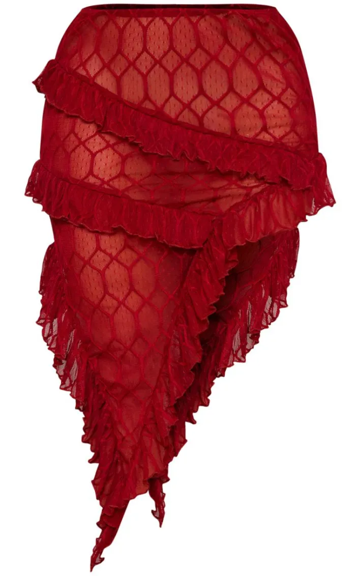 Create a look no one will forget with this statement red sheer textured ruffle asymmetric mini skirt, you’re sure to have heads turning for all the right reasons. This skirt features a red sheer textured material with ruffle detailing and an asymmetric design, you won’t be able to resist. Style this textured skirt with the matching top, heels and your fave accessories for a fierce finish.