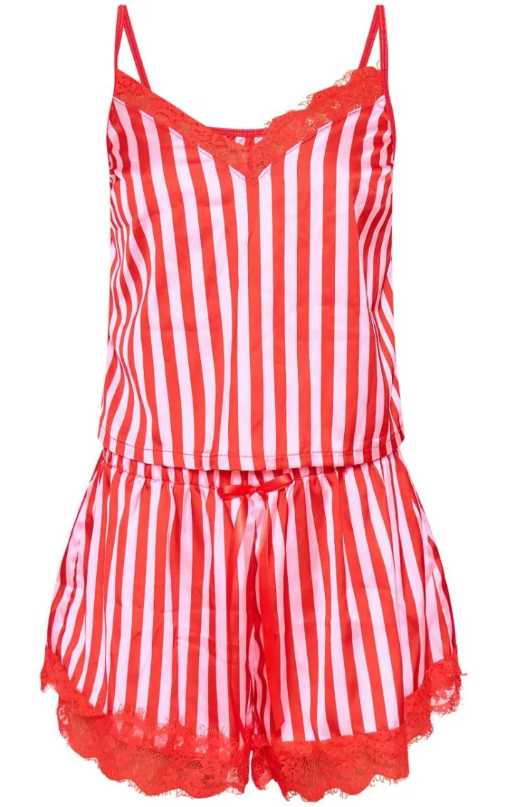 Say hello to your new season staple with this red stripe contrast lace satin cami short PJ set. Brought to you in a red hue satin material with a stripe contrast design, this cami short PJ set is a must have. How can you say no? Pair with fluffy socks and simple accessories for a cosy look perfect for those chilled nights in.