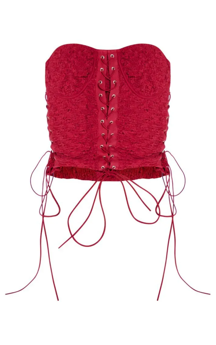 Take your weekend look to a whole new level with this red textured woven lace up bandeau crop top. Brought to you in a red hue textured woven material with a lace up design, a bandeau neckline and a cropped fit, how can you resist? This crop top is sure fitted shorts and over the knee boots to complete the look we’re loving.