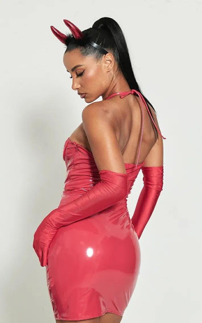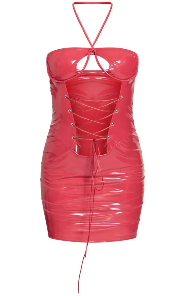 Bring all the drama to your weekend plans with this red vinyl underwired lace up bodycon dress. Brought to you in a red hue vinyl material with a flattering underwired fit and lace up detailing for that extra touch of glam, you really can’t go wrong. Style this bodycon dress with clear strap heels and statement accessories for a look that is sure to have eyes on you all night long.