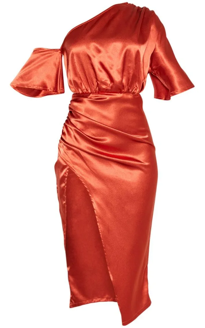 Elevate your weekend look with this dreamy dress. Featuring a rust satin material, ruched detailing and a one-shoulder design, we love this teamed with a pair of clear heels and some statement earrings for a look that we’re loving.