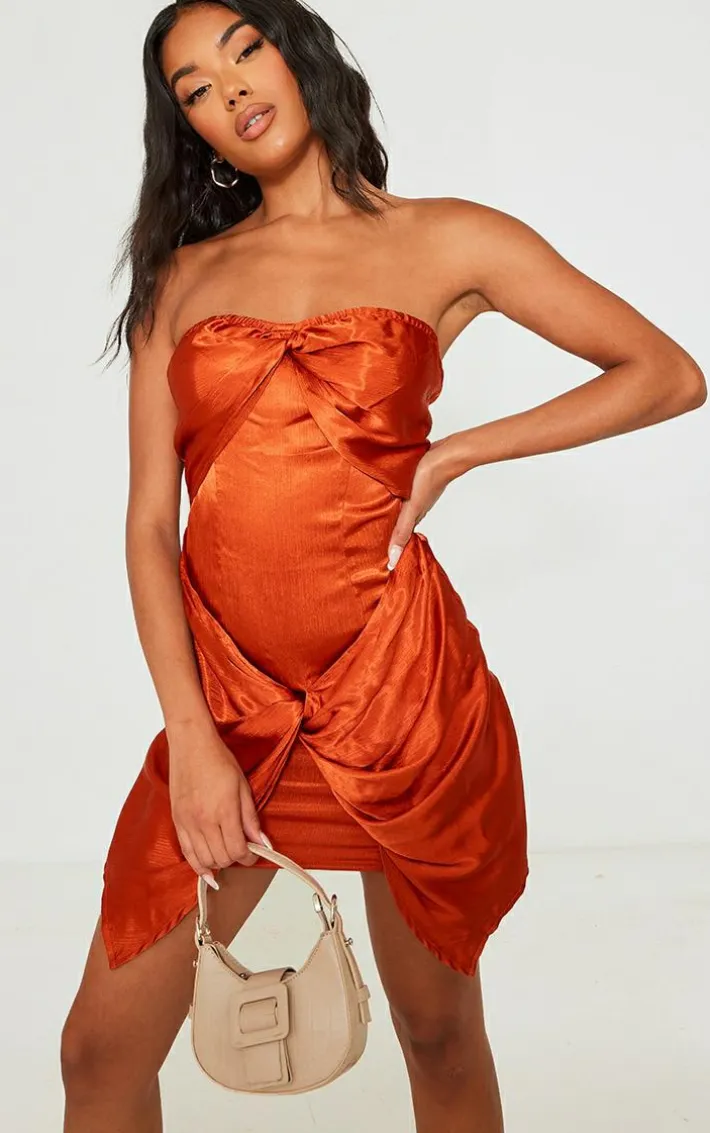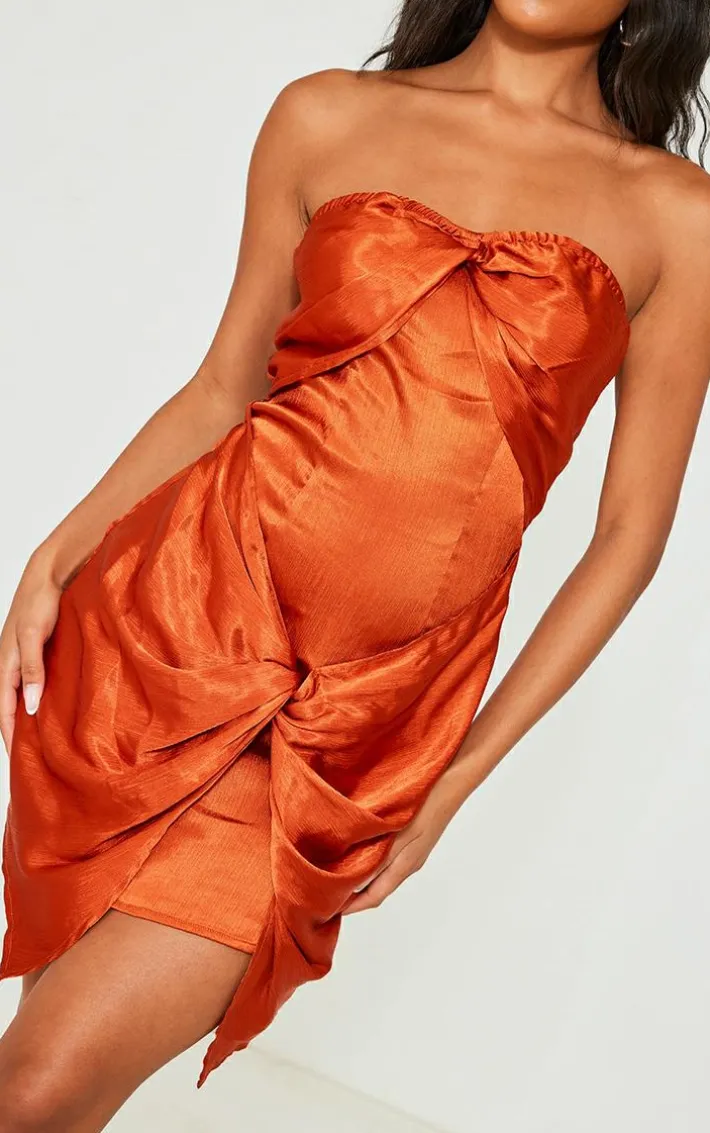 Take the stress out of weekend styling with this unreal rust textured satin twist detail bandeau bodycon dress. This dress is brought to you in a rust textured satin material with twist detailing and a bandeau style, you really can’t go wrong with this bodycon dress. Style with clear strap heels and gold accessories for a look that will have eyes on you for all the right reasons.