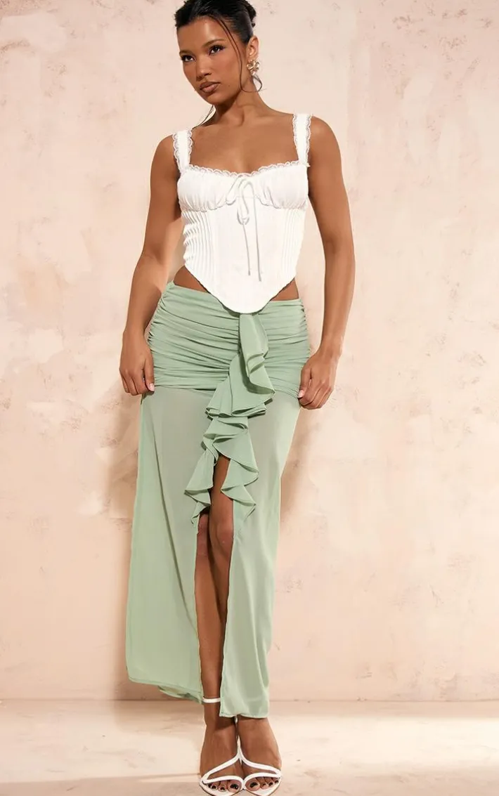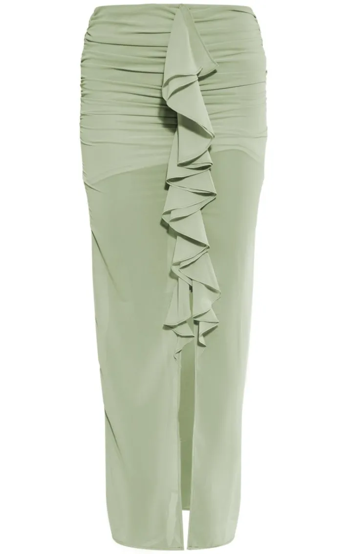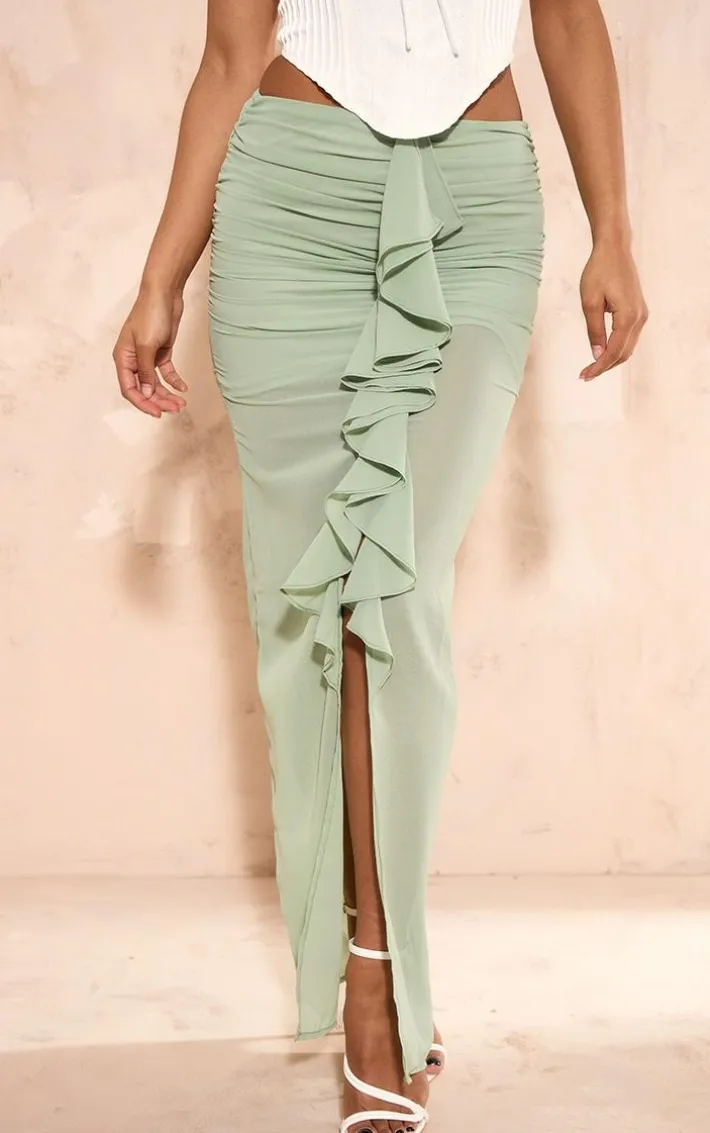 Take your new season look to a whole new level with this sage green chiffon ruffle front maxi skirt. Brought to you in a sage green chiffon material with a ruffle front and a maxi length, how can you resist? Style this maxi skirt with a white corset, high heels and accessories for a look that is sure to make heads turn for all the right reasons.