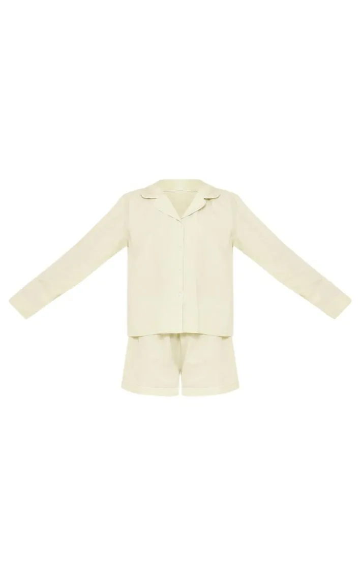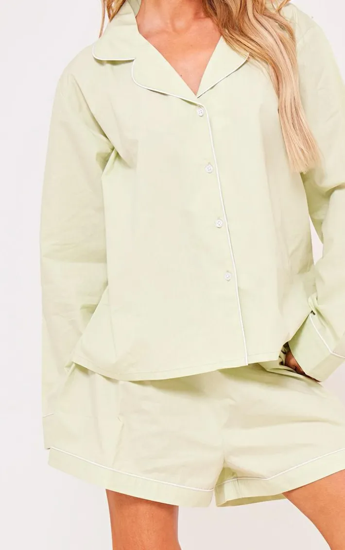 Get ready to add some dreamy pastel hues into your pajama collection with this sage green cotton poplin piping long sleeve shirt and short pj set. This set includes a long sleeve shirt and matching pj shorts, both in a sage green cotton poplin material with piping detailing, how can you not fall in love? Simply add fluffy slippers for the perfect night in look.