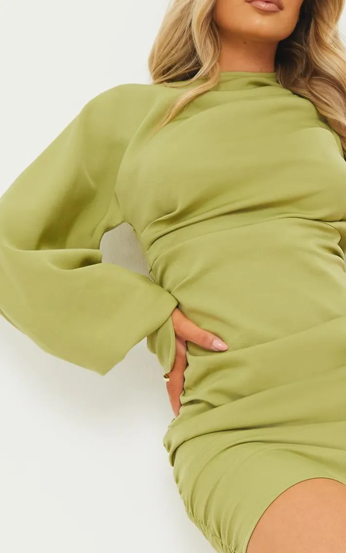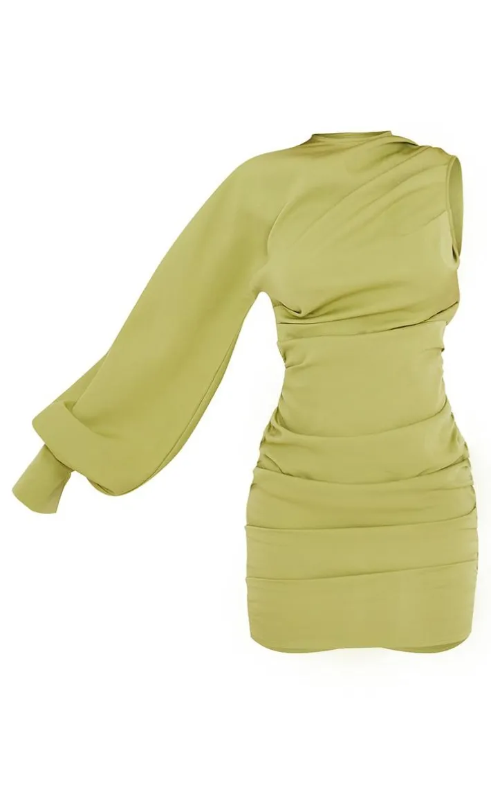 This green dress is a must-have for your new season wardrobe , green is trending and this piece will give your wardrobe a well-deserved upgrade. Featuring a sage green woven material with a one sleeve design and ruched detailing in a mini fit, how could you say no? A bodycon dress is the perfect piece for any occasion and this style is ticking all the boxes. Complete the look with slip-on heels and gold accessories for a night.