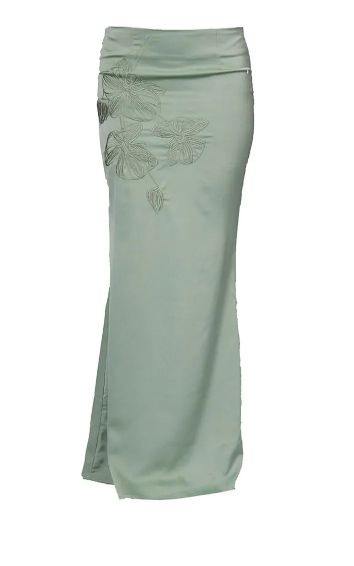 Amp up the chic vibes with this sea green satin floral embroidered midaxi skirt. It’s sure to be your new go-to. Made using a sage green satin material with a floral embroidered print and a flattering fit that will earn you all the likes, what more could you ask for? This women’s skirt is sure to be a staple. Simply pair with the matching corset top, high heels and gold hue accessories for a glam vibe that won’t go unnoticed this weekend.
