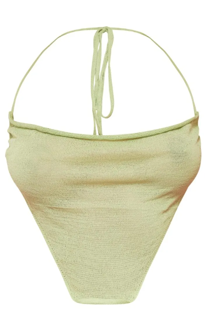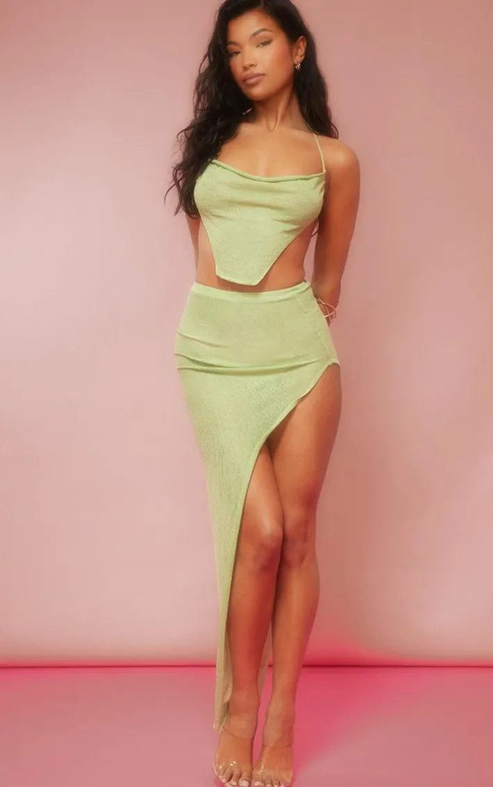 Add this dreamy top to your weekend wardrobe this season. Featuring a sage green sheer knitted material with a cowl neckline and a cropped length, what’s not to love? Wear with the matching skirt and slides to take the look the extra mile.