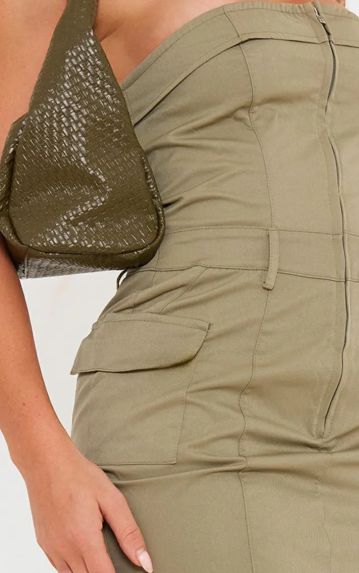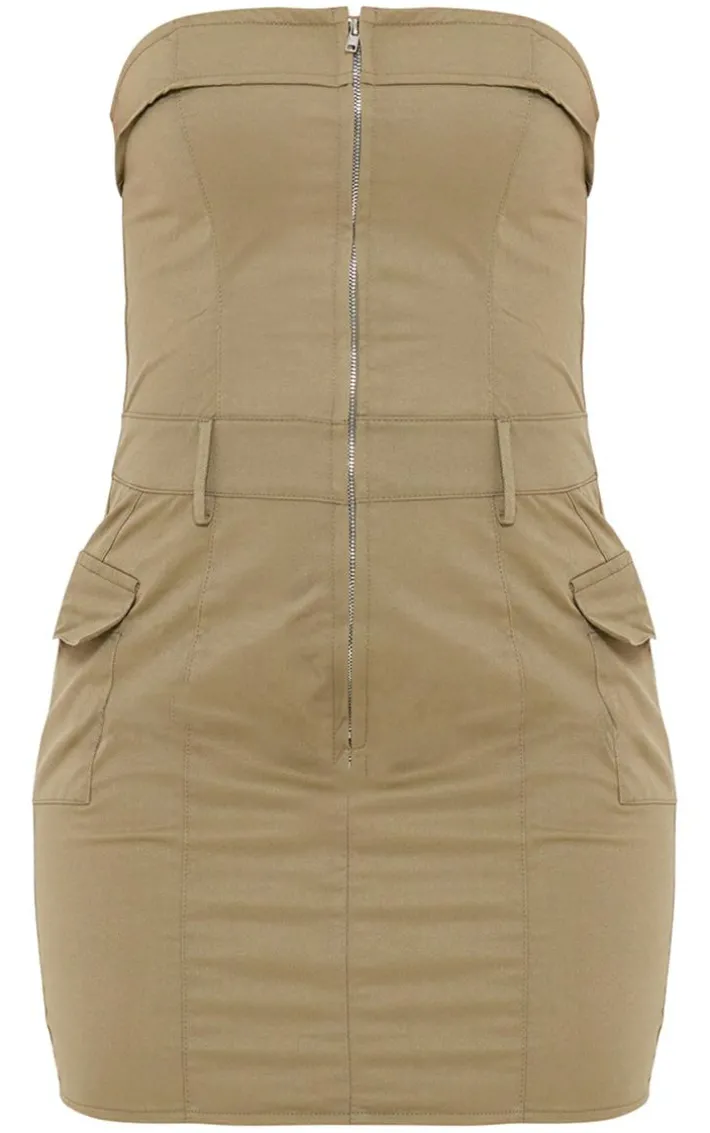 Got plans for the weekend ? Then this sage khaki cargo pocket zip up bandeau bodycon dress is sure to be a at the top of your hit list. Made with a sage khaki material with a zip up design and a bodycon style that is perfect for showing off your shape. Pair this bandeau dress with heeled mules and gold hoop earrings for a look that will earn you all the compliments.