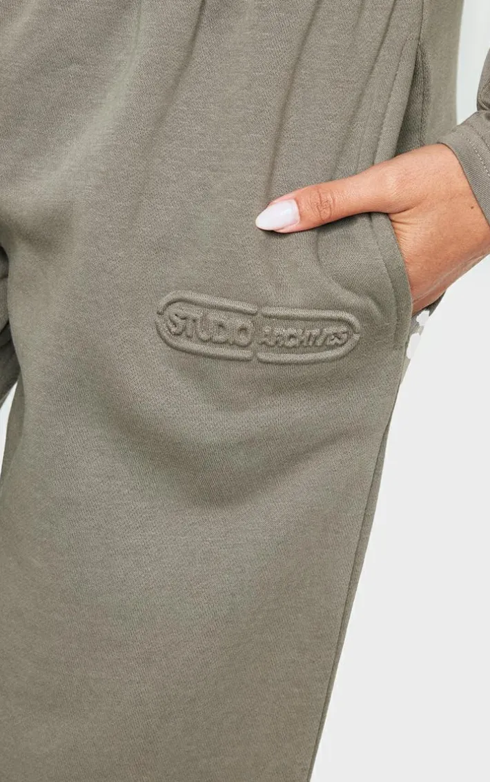 Deciding what to wear just got easier with these sage khaki embossed studio archives wide leg sweatpants. Brought to you in a sage khaki hue sweat material with an embossed ‘Studio Archives’ design and wide leg detail, these sweatpants are a must have. Team with the matching top, fresh kicks and neutral accessories for a cosy combo we’re loving.