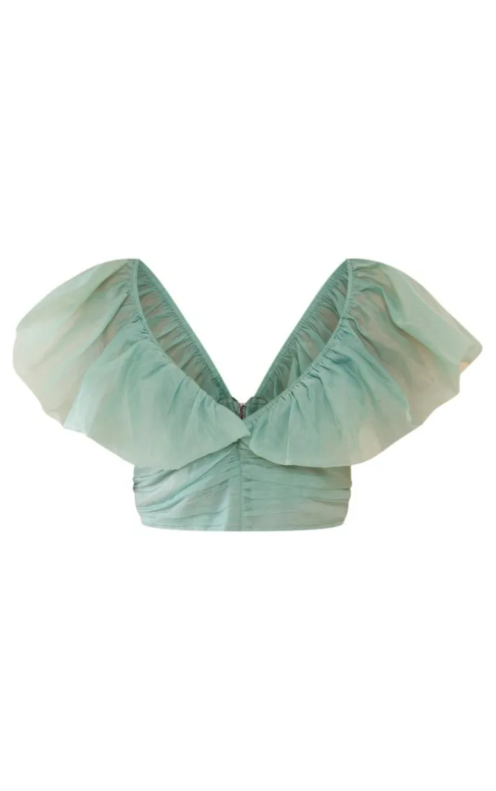 You what to ware dilemmas are finally answered with this sage organza extreme plunge ruched crop top. This top is made from a sage material with an organza design for a look that will get you noticed. With an extreme plunge detail, this crop top has a flattering fit that will have you feeling confident. Team with some of your go-to jeans and some clear heels to complete the look.